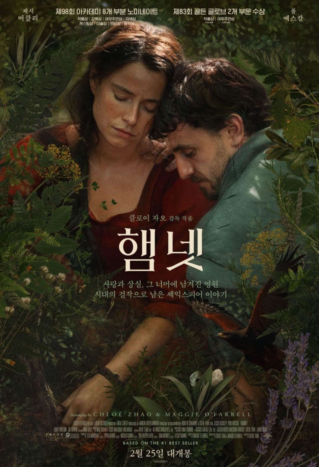 결국 이렇게 셰익스피어와 처음 만나는 처녀 시절의 달콤한 연기부터 자식을 잃게 되는 슬픔까지, 그리고 남편이 아들을 위해 만든 연극 <햄릿>을 보며 비로소 갈등이 풀리고 정화되는 희로애락의 명연기를 펼친 야네스 역의 배우 제시 버클리는 올해 아카데미에서 여우주연상을 수상했습니다. 셰익스피어 역을 맡은 폴 매스칼도 망작으로 찍힌 <글래디에이터 2>의 악평과 불명예를 씻어낸 멋진 연기를 보여주었습니다. 묘하게도 두 배우 모두 당시 잉글랜드와 매우 적대적이었던 아일랜드 출신입니다.