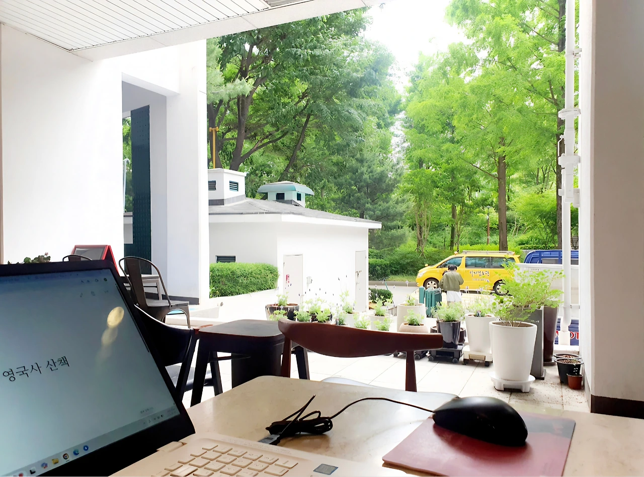 아래 녹음이 진 창밖 정경은 작년 여름에 찍은 사진입니다. 이제 얼마 안 있으면 창밖은 그 사진과 변함 없는 모습으로 푸르게 변할 것입니다. 그리고 저는 작년 봄에도 이 자리에서 글을 썼듯이 오는 여름에도 쓰고 있을 것입니다. 그러니 오늘도 저는 쓰고 있습니다. 광고 현업을 떠난 2021년 7월부터 게재한 <뉴스버스>의 원고가 내일 금요일 마감이기에 그렇습니다. 처음 2년은 꼬박 매주 한 주도 빠지지 않고 글을 썼습니다. 그리고 그 후 지금까지 2년 8개월 동안은 3주에 2회 꼴로 쓰고 있습니다. 편당 원고지 40~60매에 달하는 인문교양 에세이입니다. 그 글들이 모이고 같은 주제끼리 분류되어 4권의 <TAKEOUT> 책이 되어 나온 것입니다.
