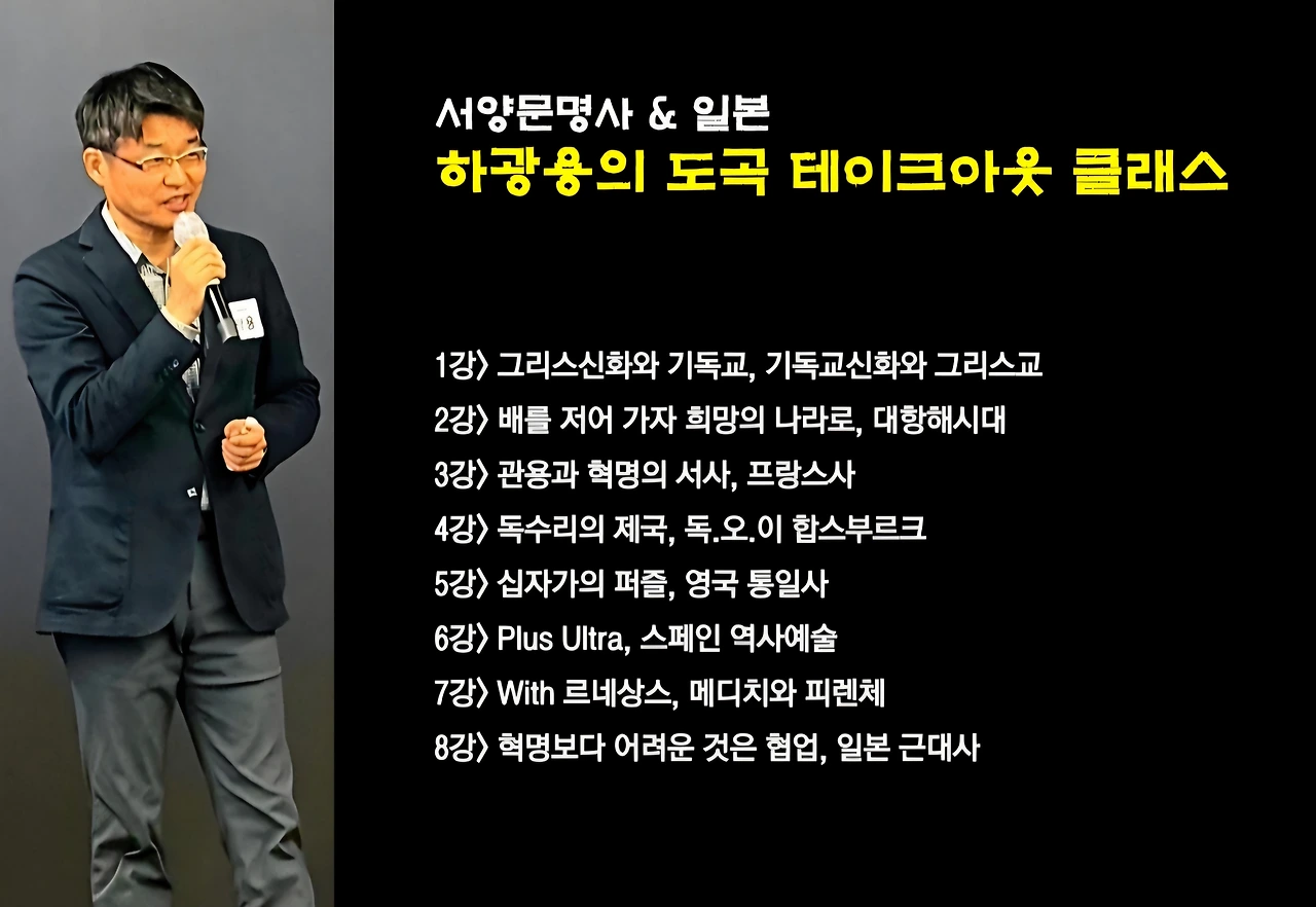 그리고 오늘 처음으로 온전히 제 이름을 건 클래스를 시작했습니다. 글이 모여 책이 되듯이 지난 1년간 하나하나 만든 강연 콘텐츠를 모아 8개의 강의를 하나로 묶은 8주 클래스를 개설한 것입니다. 서양문명사와 일본근대사를 주제로 한 강연입니다. 역시 TAKEOUT!