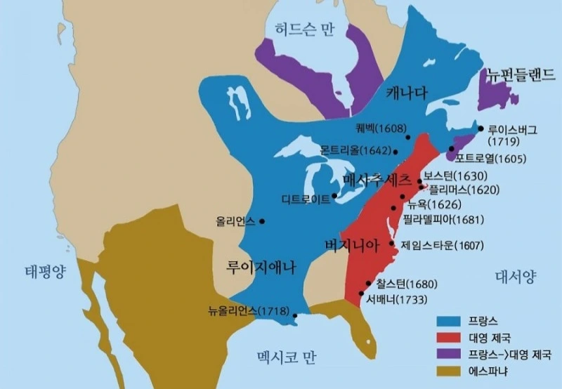 유럽 열강들의 각축장이었던 미국 독립 전 북아메리카 지형도 (출처. 그림 쏙 사진 쏙 세계사)