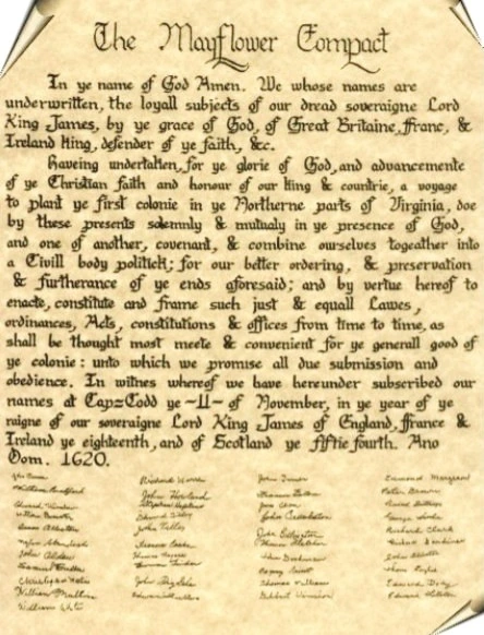 메이플라워 서약서. 원본은 분실. 아래는 서약한 41명의 서명