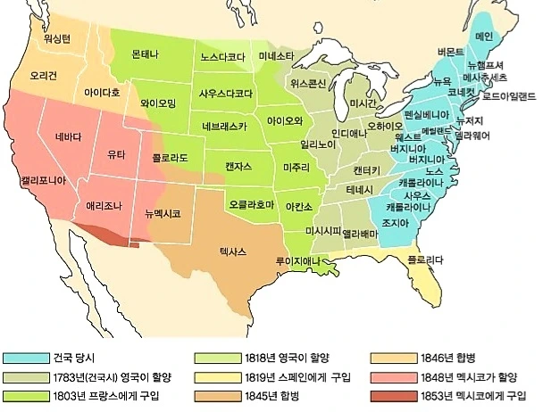 마침내 필그림 파더스의 후예들은 경쟁자들을 다 쓸어버리고 그 땅의 완전한 주인이 되었습니다. 이렇게 만들어진 그들만으로 이루어진 독립국 동부의 13개 주에서 이후 50개 주까지 가는 과정은 그들만의 내전인 남북전쟁 빼고는 큰 위기 없이 속된 말로 땅을 줍고 줍는 줍줍의 과정으로 나아갔습니다. 눈덩이가 커질수록 잘 굴러가고 더 커지는 격입니다. 종교의 자유를 찾고자 메이플라워호를 탄 102명을 가지고 동부 대서양의 조그만 항구 플리머스에서 시작한 미국이 마침내 서부 태평양까지 연결된 광활한 대국으로 완성된 것입니다.