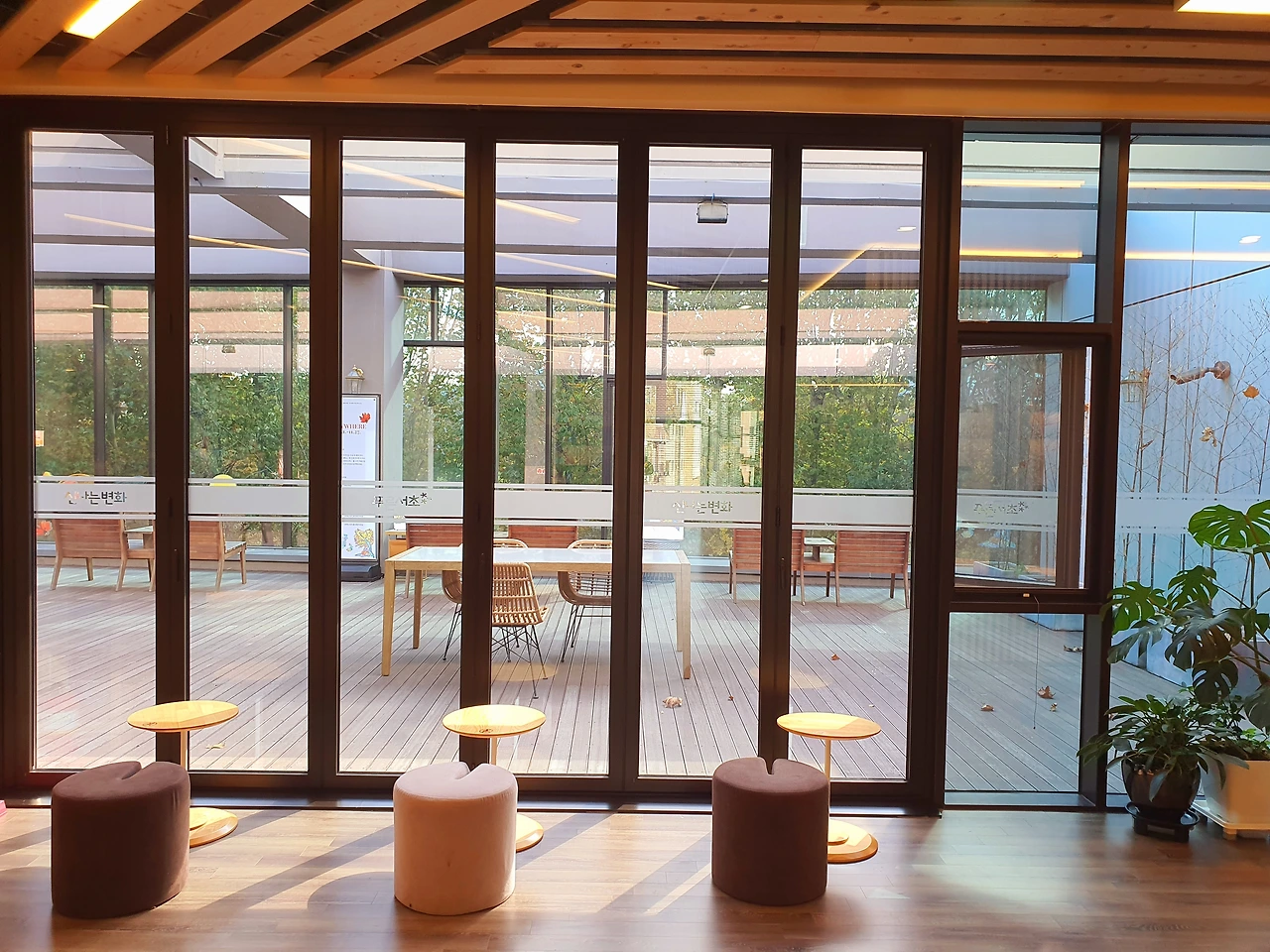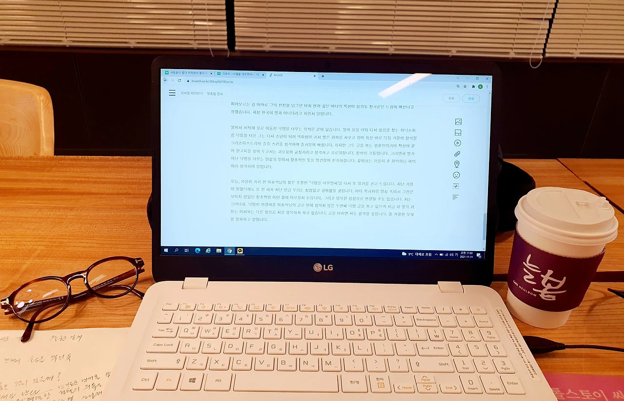그리고 지금은 목요일 정오, 방금 양재도서관 창밖으로 그간 3일간 궂었던 하늘이 열리며 햇살이 안으로 성큼 들어왔네요. 지난 월요일 빗속에서 우산을 턱에 괴고 낙엽을 찍었듯 자리에서 후딱 일어나 핸드폰 카메라를 또 찰칵거립니다. 작은 행복의 이어짐입니다. 이제 글을 마치면 저도 생각할 것입니다. 올 겨울엔 무엇을 할까 하고 말입니다. 근데 그간은 무심코 모르고 마시곤 했던 이곳 구내 커피숍 상호가 '늘봄'이었네요. 이효석 님이 그렸던 화려한 초록의 기억이 늘 살아있을 것만 같은 늘봄..