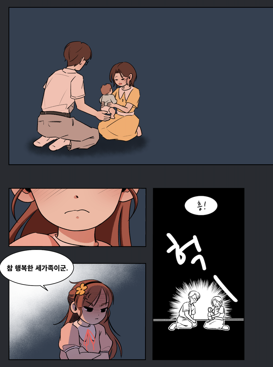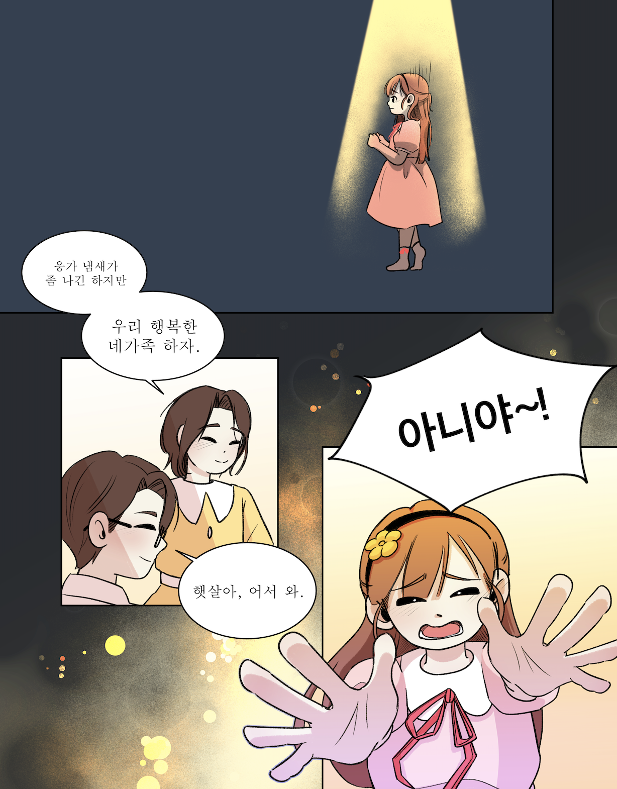이렇게 엄마만 요술이에게 가면 아빠가 햇살이랑 같이 있으니 햇살이 마음이 그래도 좀 괜찮을 텐데, 세상에나 오늘은 요술이의 대박 응가로 인해 아빠마저 요술이에게 가게 되었네요. 그리고 이어지는 요술이와 엄마 아빠의 행복한 모습. 이 순간 혼자 덩그러니 남은 햇살이가 드디어 폭발하고 말았습니다.
