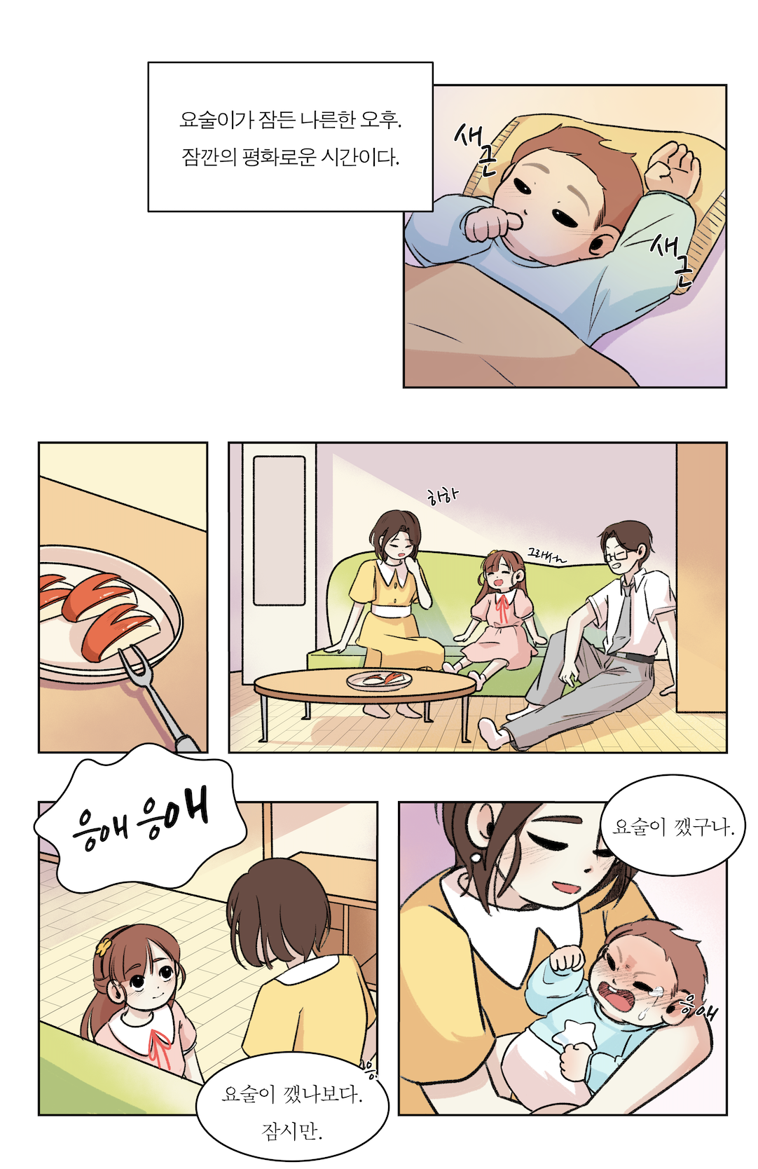수시로 울며 엄마를 불러 자기 옆에 딱 붙여 놓는 요술이가 낮잠을 자는 시간. 하루 중 가장 집 안이 평화로운 시간에 햇살이와 엄마 아빠는 도란도란 이야기를 나누고 있습니다. 그런데 평화로운 시간도 잠시, 요술이의 울음으로 다시 집 안이 시끌시끌해졌습니다. 이 순간 제일 싫은 사람은 누구일까요? 바로 햇살이입니다. 햇살이에게는 요술이가 낮잠을 자는 이 짧은 순간이 예전처럼 엄마 아빠를 독차지하며 이야기도 하고 놀 수도 있는 시간인데 요술이가 깨버렸으니 기분이 썩 좋을 리가 없습니다. 요술이가 깨서 울고 있으니 엄마가 요술이에게 가는 건 당연한 일이겠지만 요술이에게 가는 엄마에게 서운해지고, 엄마를 데리고 가버리는 요술이가 밉고 질투 나는 것 역시 햇살이의 당연한 마음이겠지요. 요럴 때 엄마가 어떻게 대처하느냐에 따라 가족의 평화가 결정된답니다. 엄마는 햇살이에게
