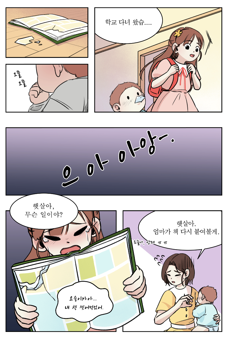 "햇살아. 엄마가 책 다시 붙여 볼게."
