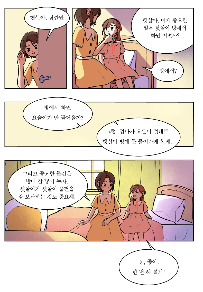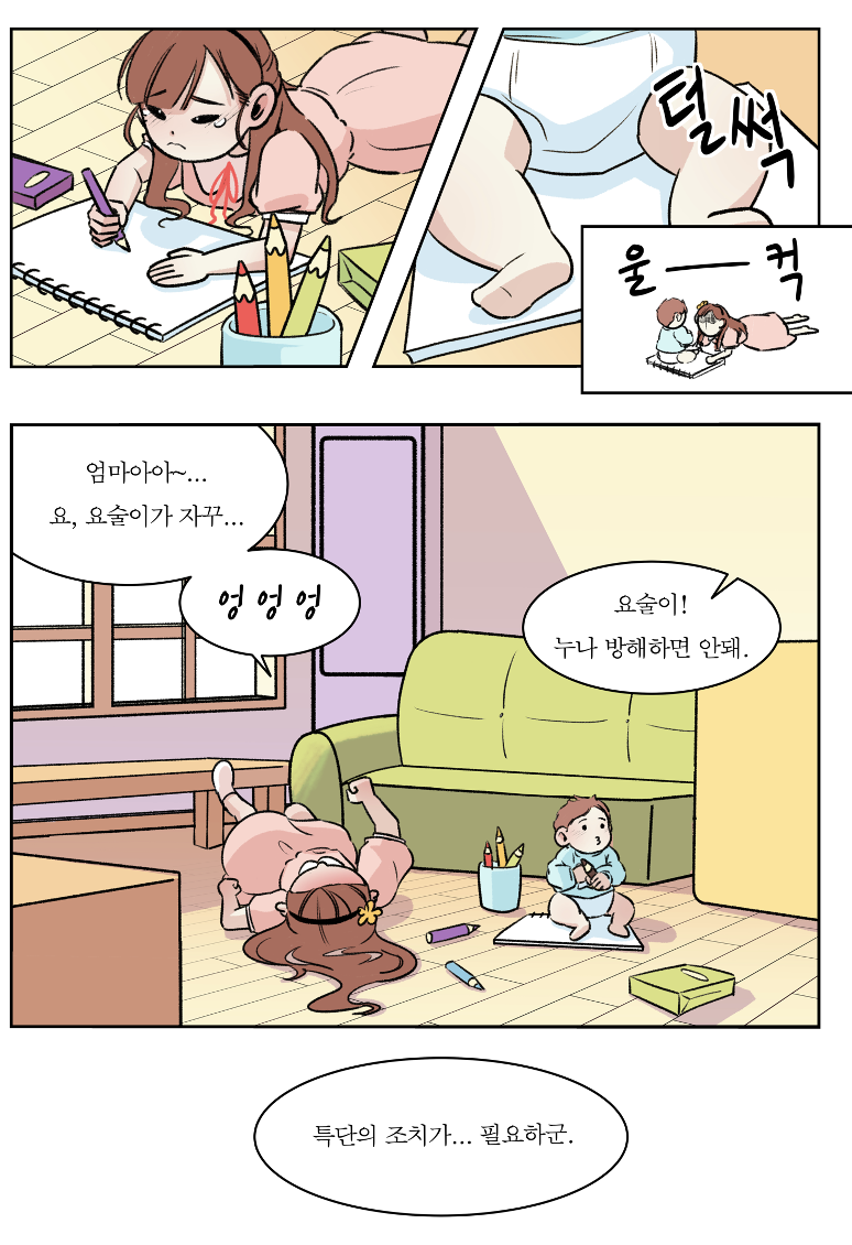그럼 이게 끝일까요? 끝이면 좋겠지만 앞으로 이런 일은 많이 더 많이 생길 수 있습니다. 그래서 엄마는 햇살이에게 중요한 일은 방에서 하도록 특단의 조치를 내렸습니다. 부모가 동생을 잘 돌보아서 다시는 동생이 첫 아이를 방해하는 일이 없도록 할 수 있다면 참 좋겠지만 점점 자라면서 호기심과 움직임이 많아질 동생을 완벽하게 첫 아이로부터 분리하는 건 불가능한 일입니다. 그래서 부모가 동생으로부터 첫 아이를 분리하여 보호하는 것도 중요하지만 조금 더 근본적인 해결책으로는 첫 아이가 동생으로부터 자신이 방해받지 않도록 스스로 예방을 하는 것이 중요합니다. 애초에 문제가 될 만한 상황을 만들지 않는 것이지요. 그리고 첫 아이가 자기 방에서 중요한 활동을 하도록 하기 위해서는 첫 아이의 동의가 꼭 필요합니다. 만약 동의 없이 방에서 하라고 하면 마치 부모가 첫 아이를 방에 가둬버리는 것처럼 보일 수 있기 때문입니다.
