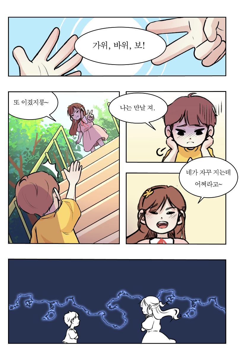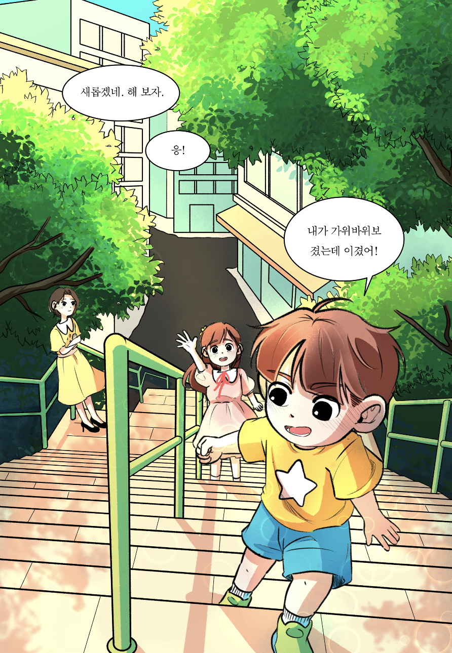 햇살이와 요술이가 계단 먼저 오르기 놀이를 하고 있습니다. 가위바위보는 특별한 기술이 필요한 것도 아닌데 자꾸만 지게 되는 요술이는 그만 토라져 버리고 말았습니다. 예전에는 그저 누나와 같이 노는 것만으로도 좋았던 요술이지만 이제는 이기고 지는 것이 무엇인지 알게 되면서 이기고 싶은 마음도 생겼기 때문입니다. 하지만 햇살이도 만만치 않은 승부욕으로 반드시 이기리라는 마음으로 놀이에 임하니 요술이는 누나에게 질 수밖에 없나 봅니다.