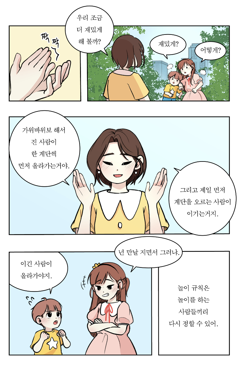 그런데 아이러니하게도 늘 가위바위보에서 지던 요술이가 이긴 사람이 올라가야 한다는 말을 하고 있습니다. 아이들은 어릴수록 융통성 있게 사고하는 것이 어려우니 규칙을 바꾸고, 바뀐 규칙을 수용하며 놀기까지는 시간이 좀 걸립니다. 잘 설명하고 기다려 주는 지혜가 필요합니다. 절대로 "넌 만날 지면서 그러냐."라고 핀잔을 줄 필요는 없습니다.