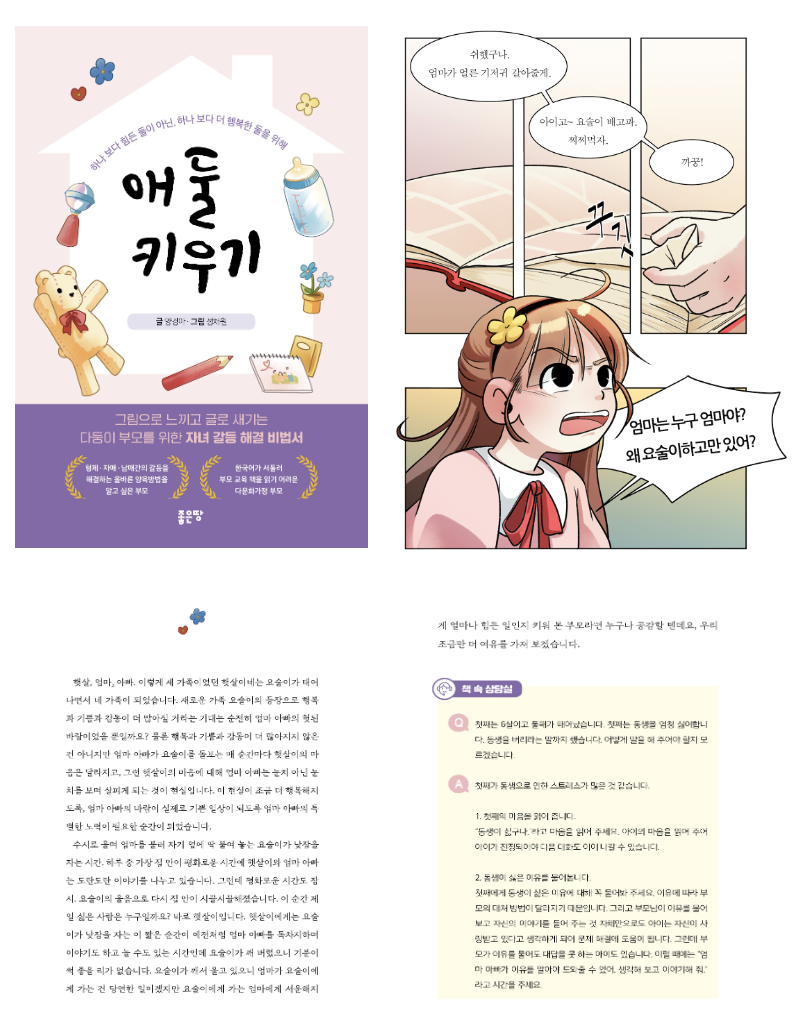 [애 둘 키우기]는 형제자매남매 갈등 다루기 2권으로 1권 [첫 아이와 함께 하는 동생맞이]에 이어 요술이가 태어난 후 햇살이와 어떻게 커가는지에 대한 이야기입니다. 요술이의 임신 기간 중에 햇살이와의 이야기를 다룬 1권을 출간했을 때는 뭔가 해야 할 일을 덜 한 것 같은 기분이었는데 2권을 출간하는 지금은 해야 할 일을 다 한 것 같은 기분이 듭니다. 요술이가 태어나기 전 보다 태어난 후의 일상이 더욱 신경 쓸 일이 많았고 그만큼 할 이야기가 많았기 때문입니다.