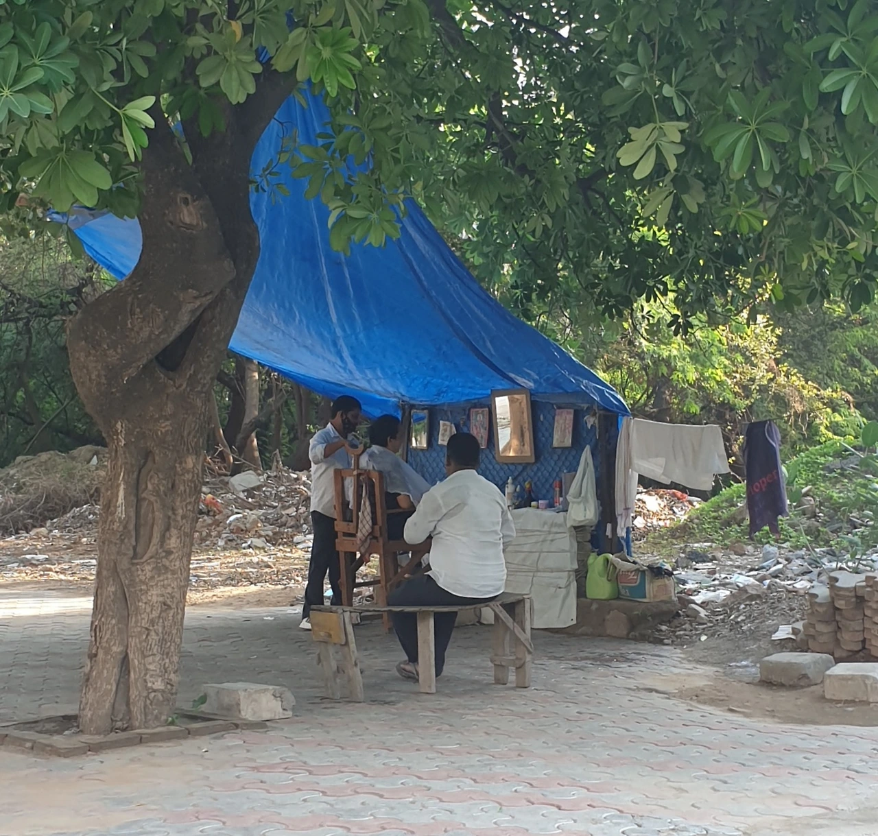 노상 이발관도 영업을 시작합니다. 오늘부터 영업 재개입니다. 새벽 6시 반인데 벌써 한사람 대기중이네요.