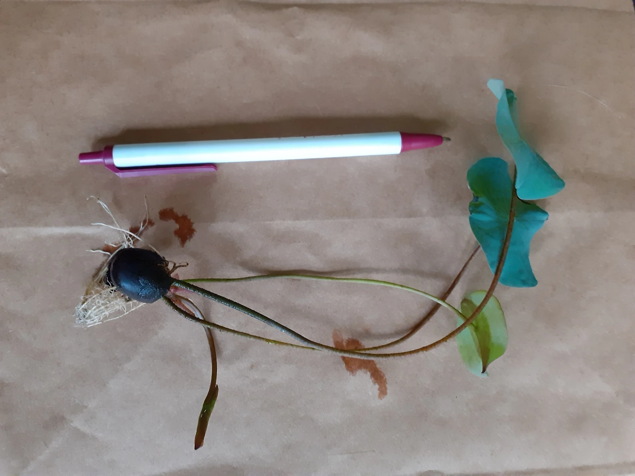 큰 물통을 잘라서 임시로 만들었는데 종이컵에 흙을 담아서 풍덩시켜 놓았다. 연잎이 까매진 것은 삼일간 실내에서 몰리와 함께 있던 탓이다.