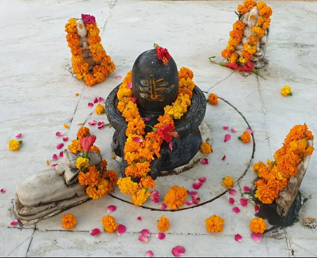 7월은 시바신의 달이라고 특별히 금잔화와 장미, 히비스커스로 정성스레 장식하고 우유를 붓고 물로 씻어내는 의식을 했습니다. 저도 물로 씻어내는 것을 권해서 참여했습니다. 이마에 티카도 찍어주셨네요.