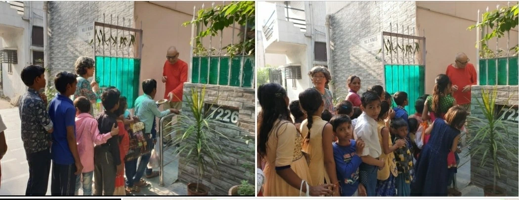 특히 두르가 푸자 즈음해서 동네 주변의 어린아이들이 몰려다니며 벨을 울리면 그분은 아예 점심으로 푸짐하게 준비해서는 집 대문앞에서 아이들에게 나누어주었습니다. 그는 일회용 접시에 일일히 담아서 직접 얘들에게 건네주었는데, 이때 우리 부부는 아이들 줄을 세운다든지 허드레 일들을 옆에서 거들었습니다. 당시 저는 집에 모아둔 1,2루피 짜리 동전이 많아서 그것을 아이들에게 나눠주기도 했습니다.
