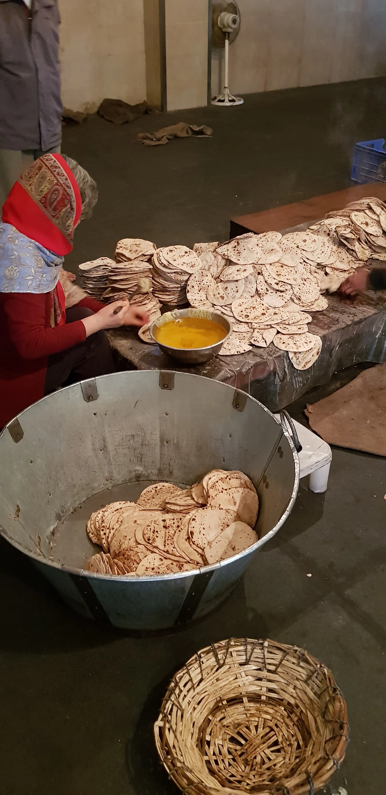 골든템플 랑가르 식사 준비하는 곳에서 짜파티에 버터를 바르는 모습. 기계에서 끊임없이 짜파티가 나오고 한 켠에서는 손으로 직접 짜파티를 만들고 화덕에 굽고.. 봉사자들에게 경의를