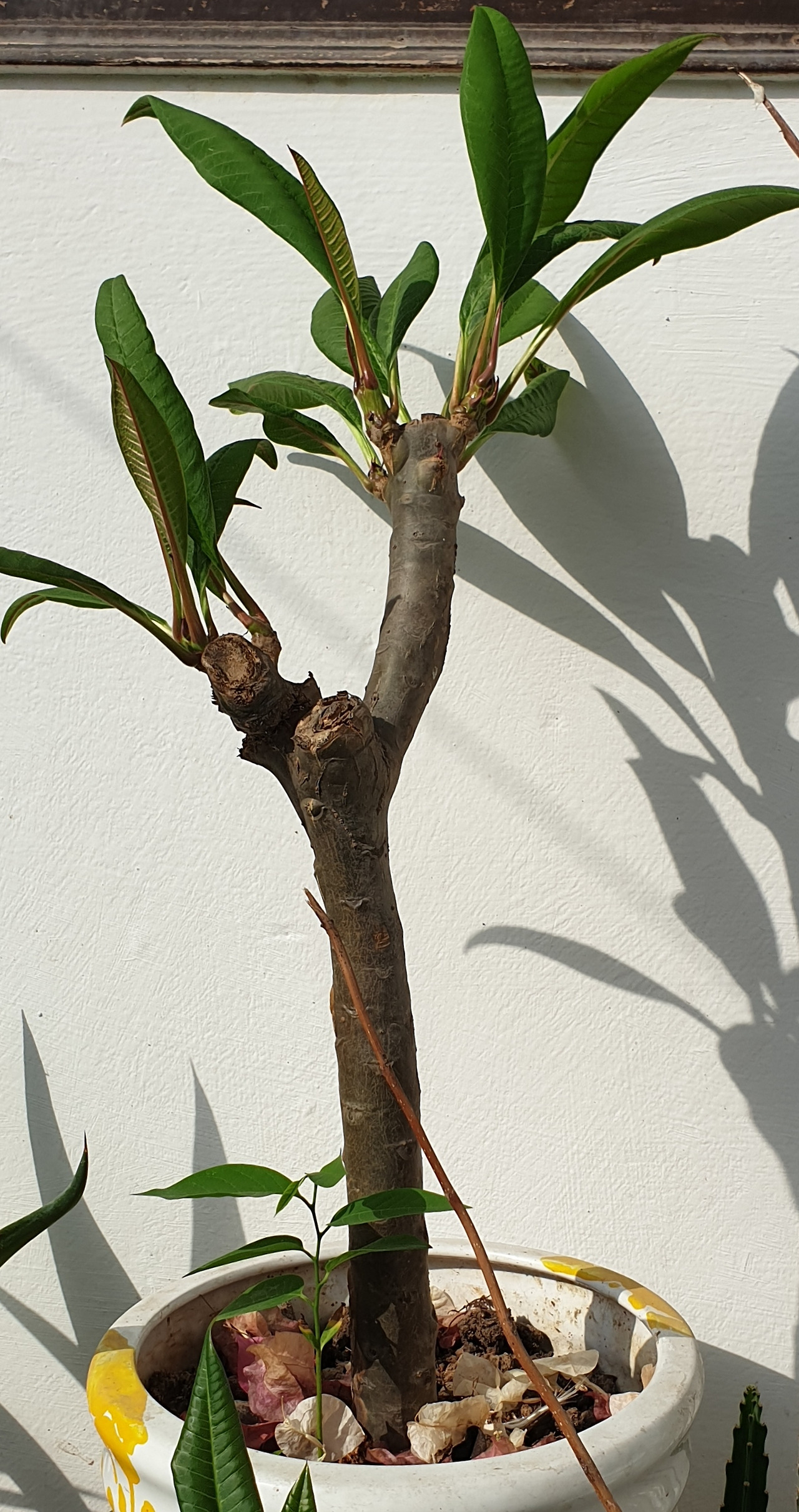 큰나무에서 자른 아이보리 참파 세가지중 한가지를 붉은색 참파가지와 접붙여 놓았는데 성공입니다. 잘 자라고 있습니다.