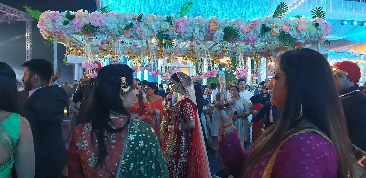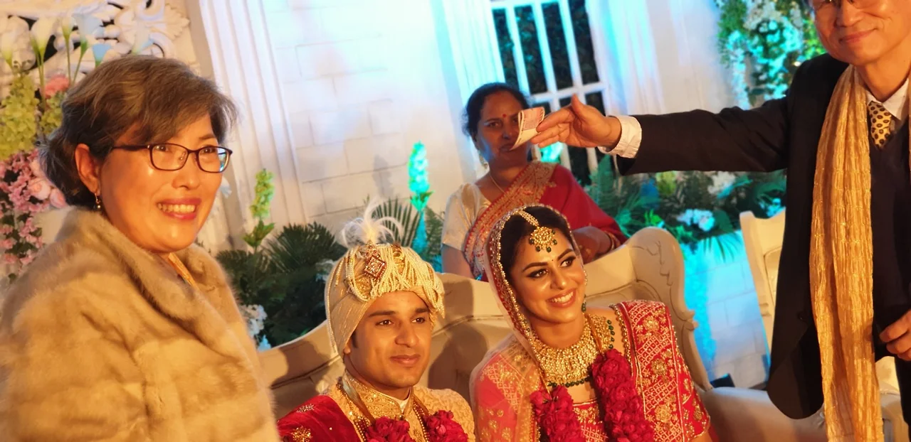 무대위에서 돈을 신랑,신부머리위로 돌리면서 축하를 하더라고요. 거금 2000루피 새돈으로 그들의 행복을 빌어주었습니다.ㅎㅎㅎ