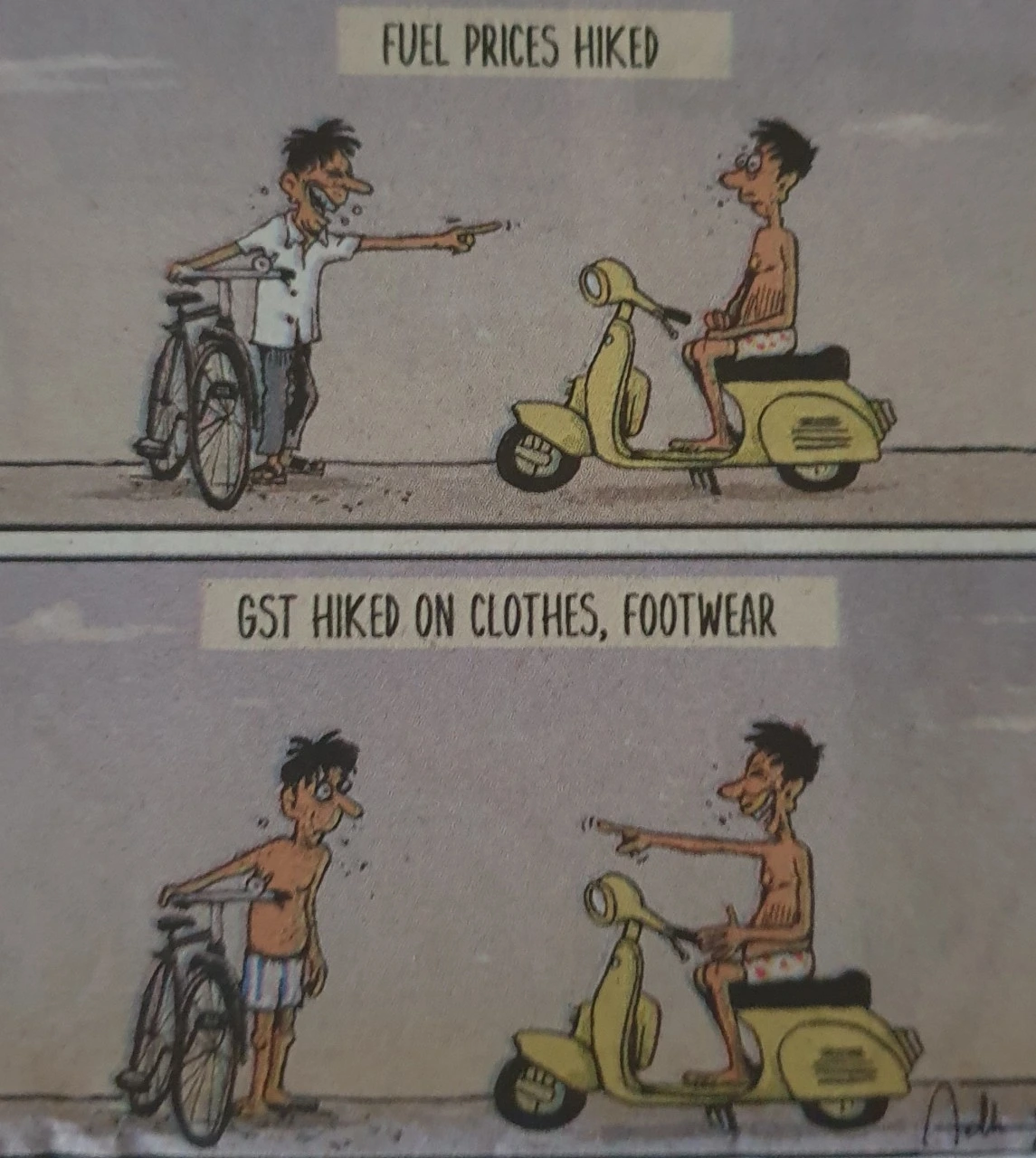 유류비가 오르더라도 나와는 관계없다며 비싼 스쿠터 가진 이에게 고소하다면서 손가락질하며 껄껄 되는 것도 잠깐 한 순간... 유류비 인상으로 인해서 제반 생필품에 각종 세금이 가랑비에 옷 젖듯이 반영되면 상대방에게 손가락질 하던 자전거 타던 이들에게도 웃통 신발 모조리 벗게 만듭니다.