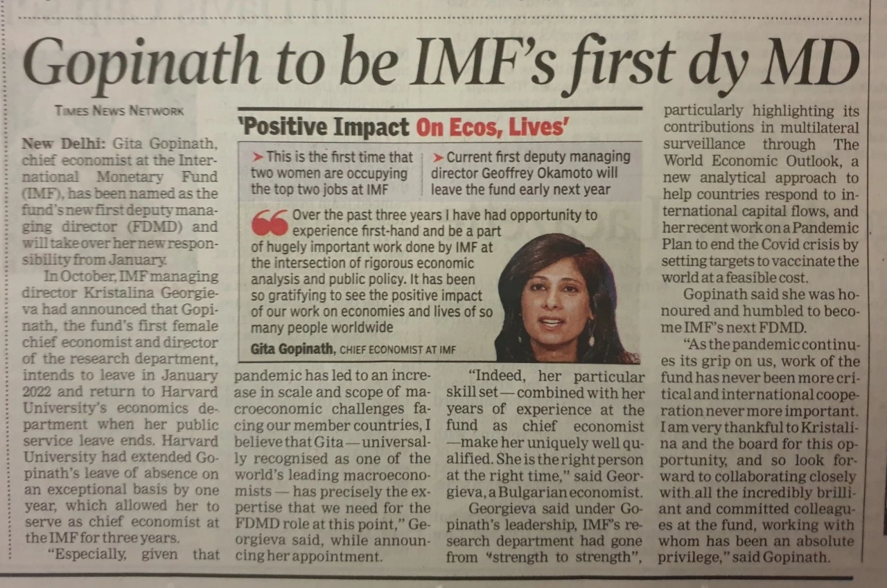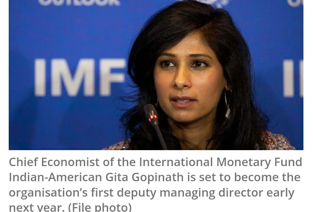 인도계 미국인인 기타 고피나트Gita Gopinath, IMF 수석 경제학자 자리에서 제 1 부총재로 승진했다는 소식입니다. 지난 2년간 그녀는 금융부문.경제성장 관련하여, 인도 미디어와의 인터뷰를 통해서 직,간접적인 자문을 하면서 인도를 도왔습니다.