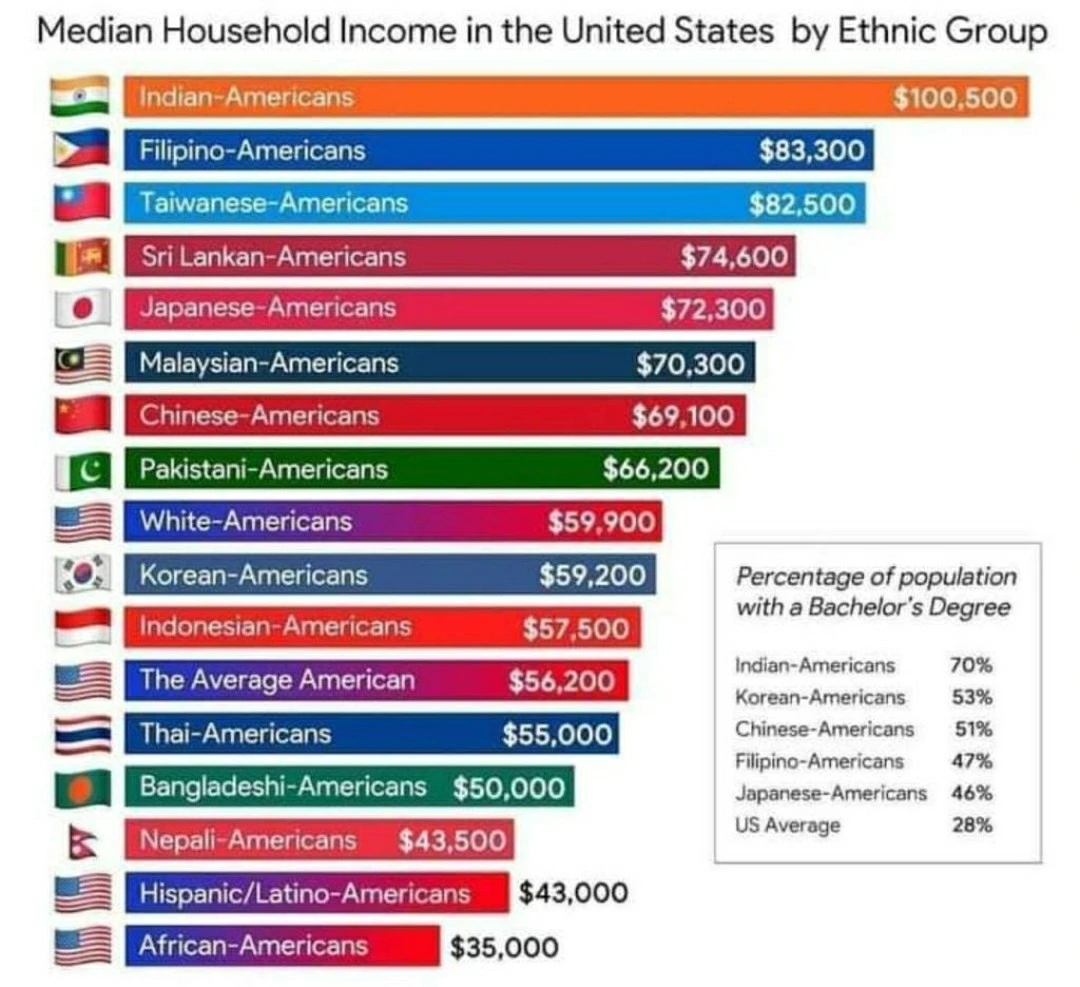1. 아래 그래프는 일인당 소득이 아니라 가구당 소득 중위치를 말합니다. 시사하는 바는 전체 인종 중에서 인도계 가구 중위소득이 가장 높습니다. 대한민국은 중위권 순위입니다.