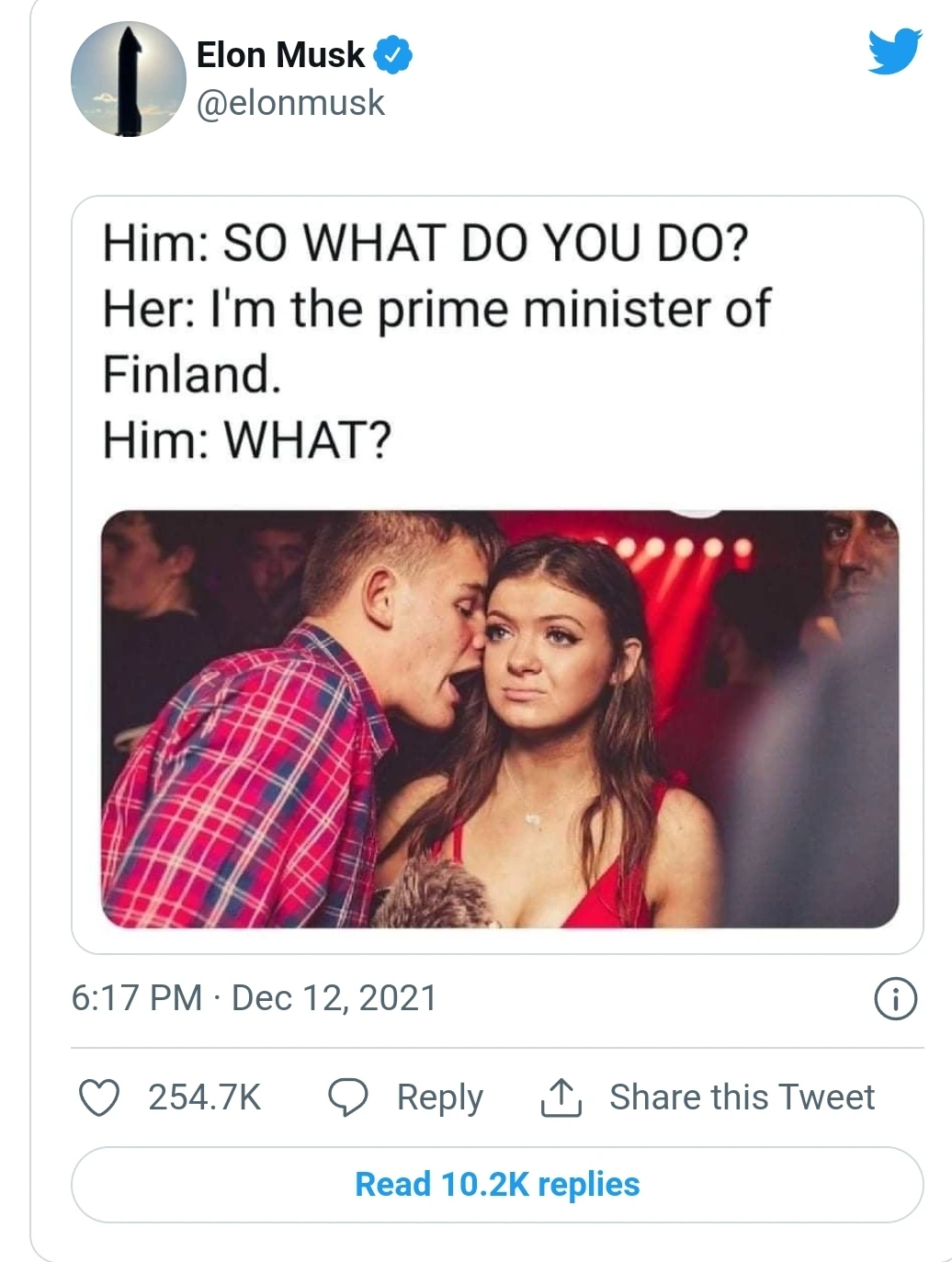 The photo included a meme of two young adults in a nightclub, alongside the captions; "So what do you do for a living? I am the Prime Minister of Finland."