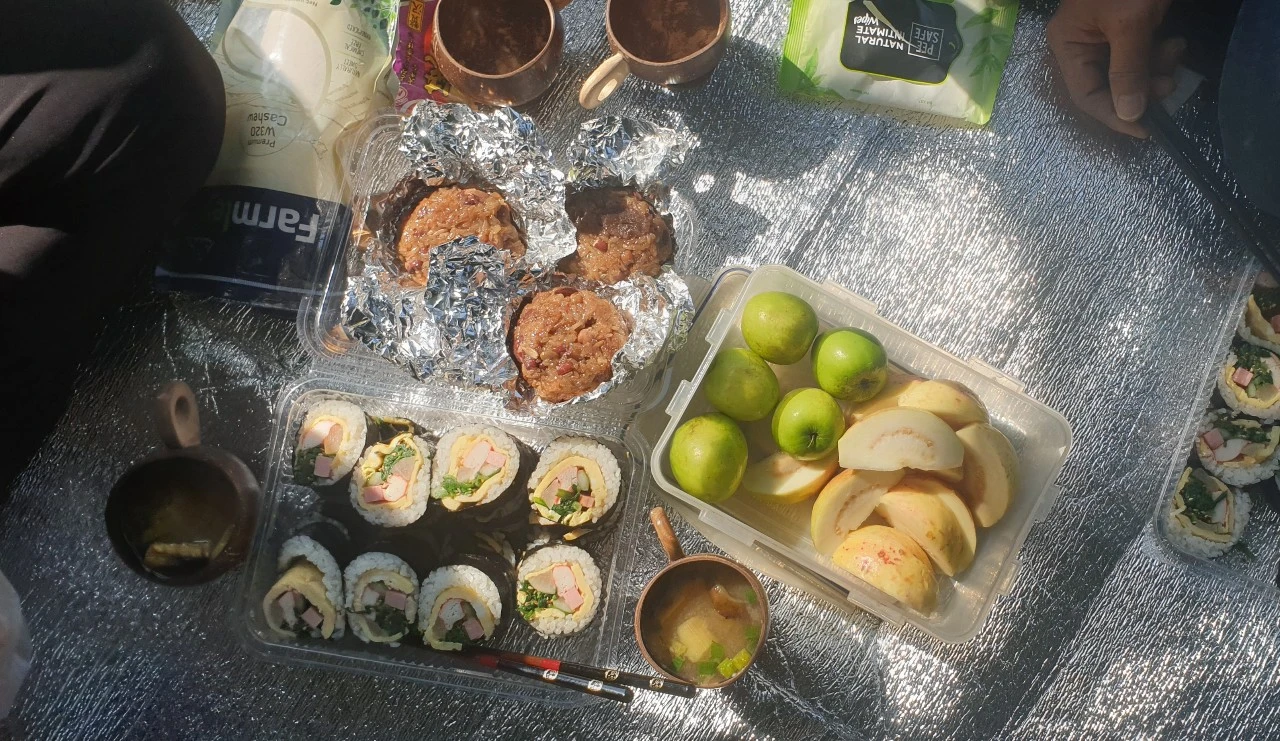 인스턴트 된장국도 가져오고 김밥도 맛있었다. 우리집 구아바가 특히 잘익어서 맛있었고 베르도 처음 먹는 다고 하는데 몸에 좋다고 얘기해주었다.