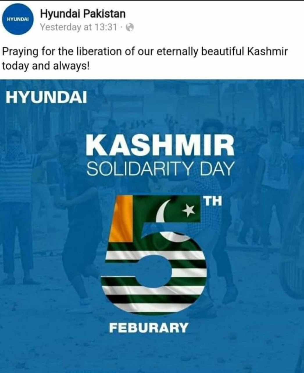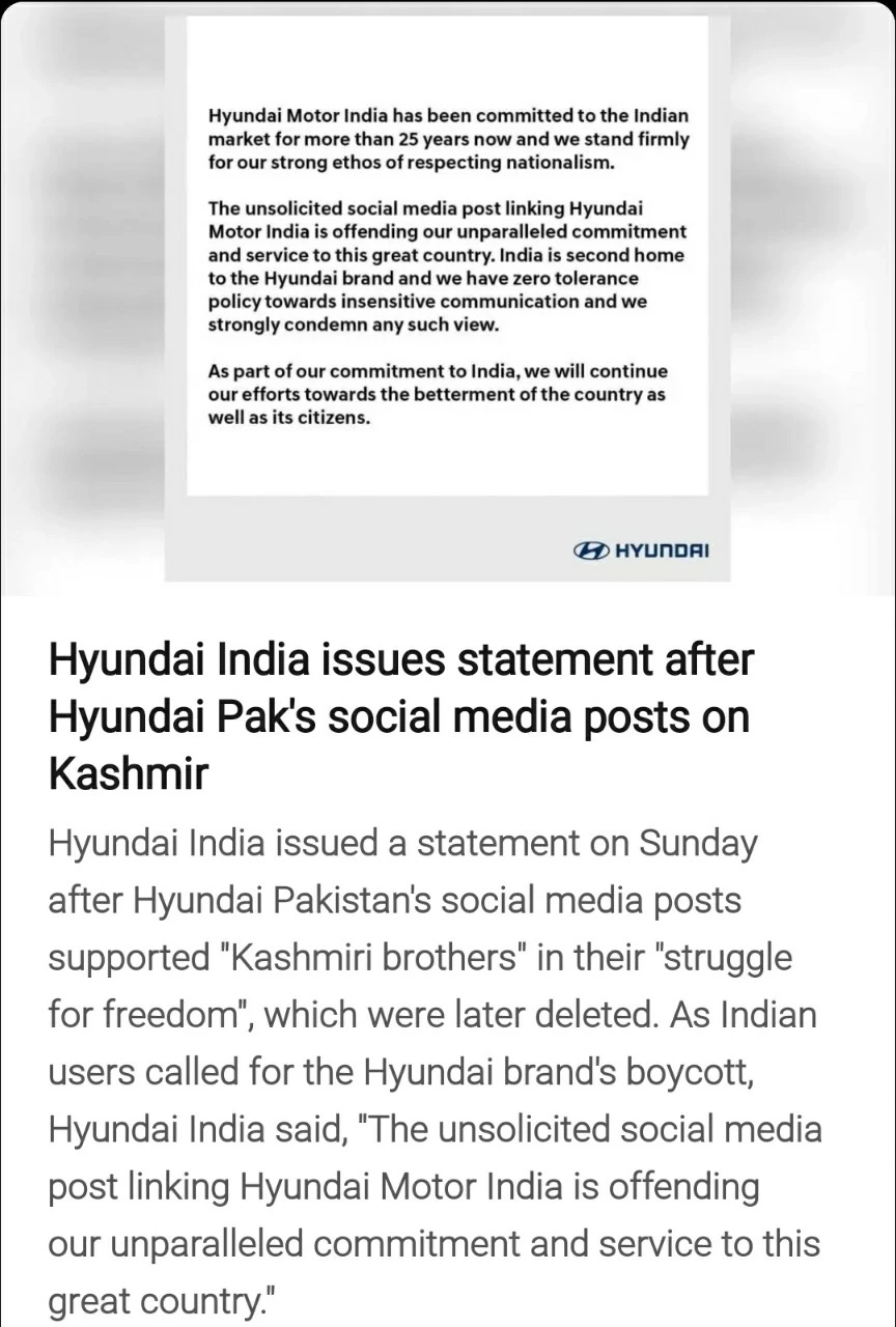 {일요일, Hyundai Pakistan의 소셜 미디어가 "자유를 위한 투쟁에서 카쉬미르 형제를 지지한다"는 게시물을 올렸음}