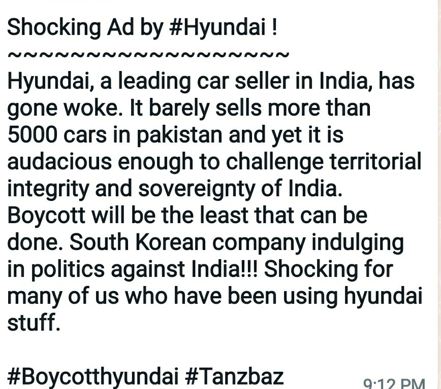 인도의 대표적인 자동차 판매업체인 현대차가 잠에서 깼습니다. 파키스탄에서는 5,000대도 안 팔리지만, 인도의 영토보전과 주권에 도전할 만큼 대담합니다. 당장 최소한으로 취할 수 있는 것은 불매운동입니다. 인도에 대항하여 정치에 몰두하고 있는 한국 기업입니다! 현대 제품을 사용해 온 많은 이들에게 큰 충격입니다.}
