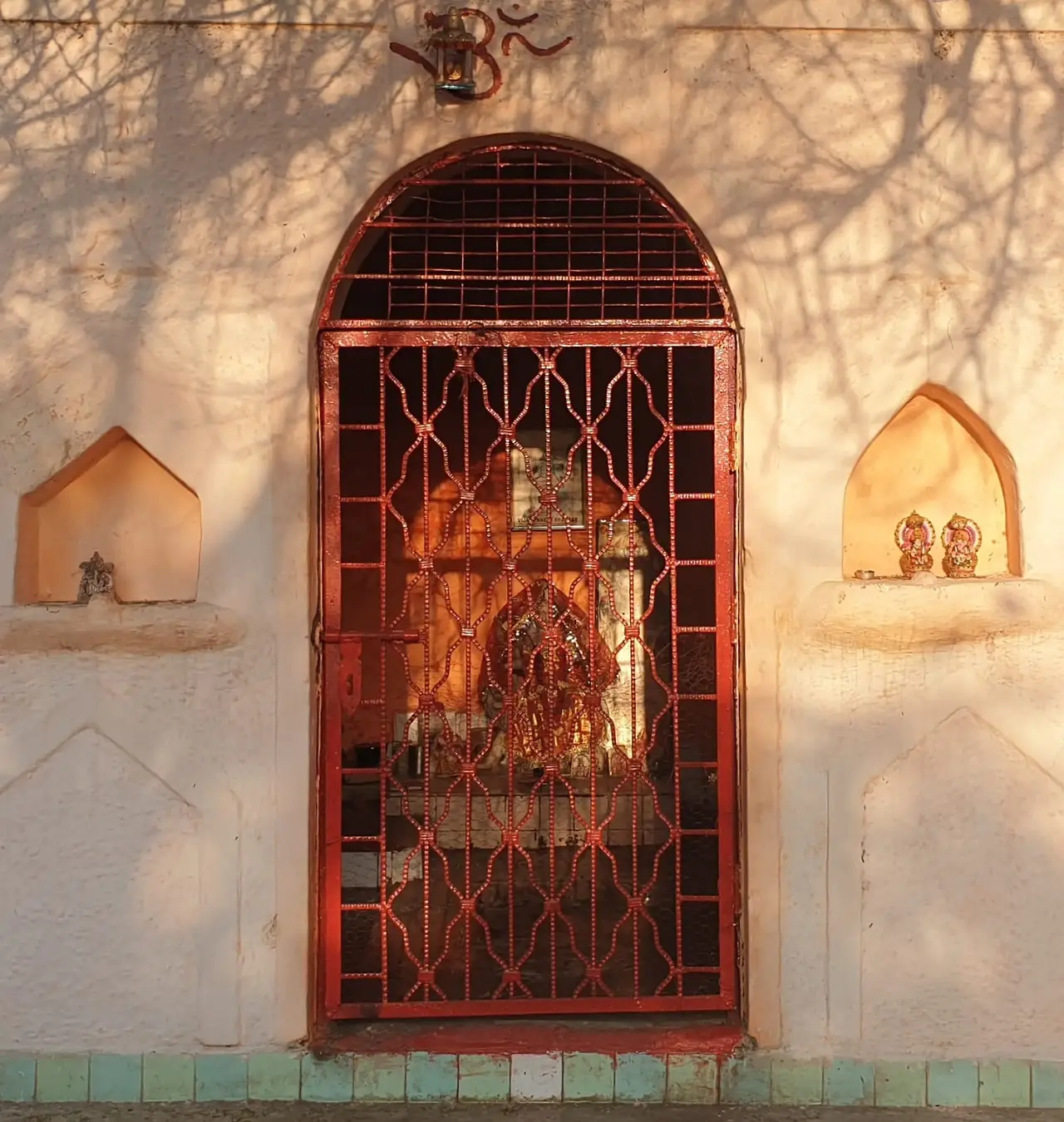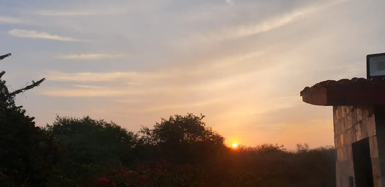 수리야 나마스테... 해를 보면서 기도하는 사람과 작은 템플