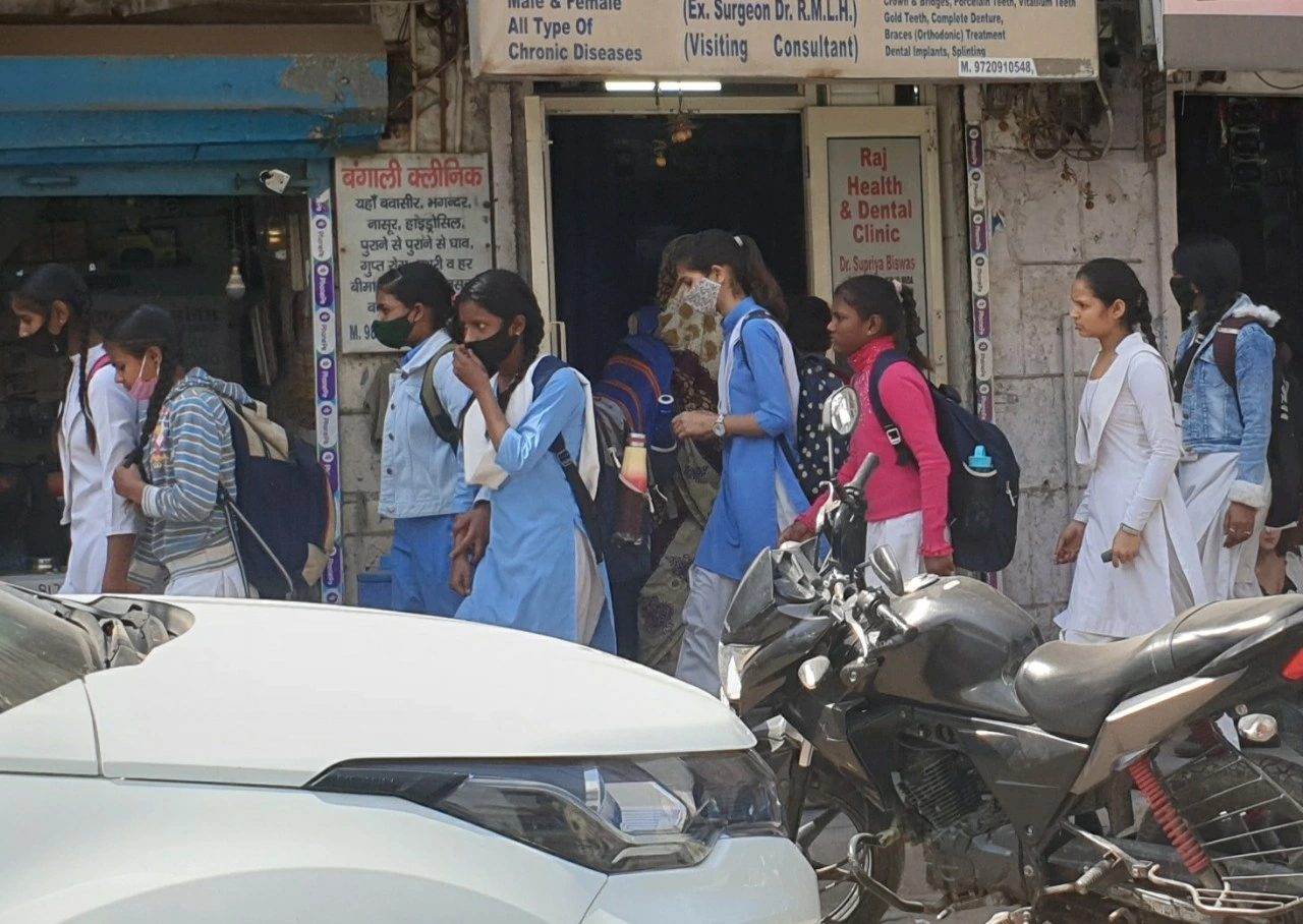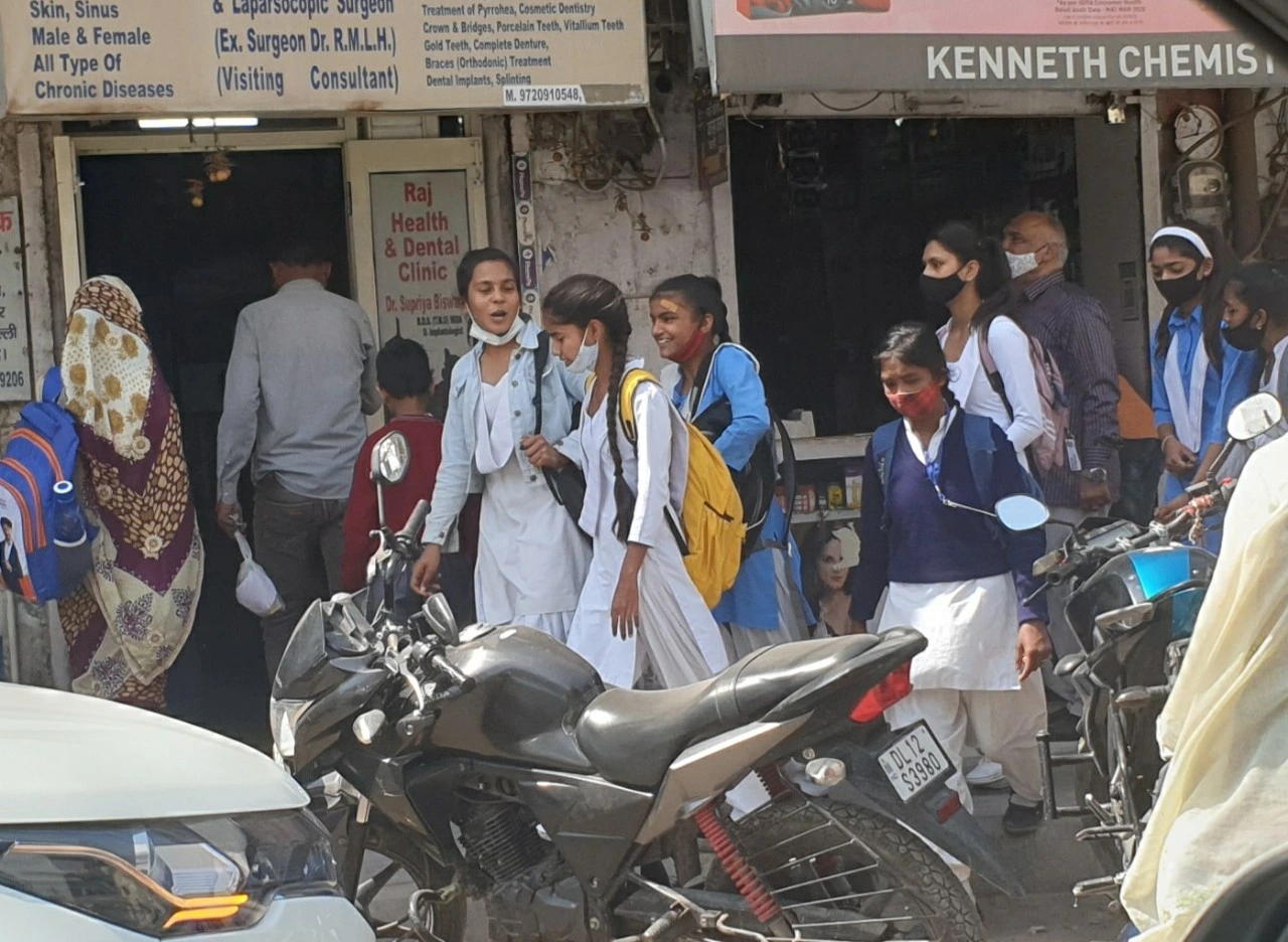 구루가운 가는 길에 복잡한 마히팔푸르지역에서 하교하는 govt 스쿨 학생들, 번잡한 상업지역을 지나가고 있습니다.