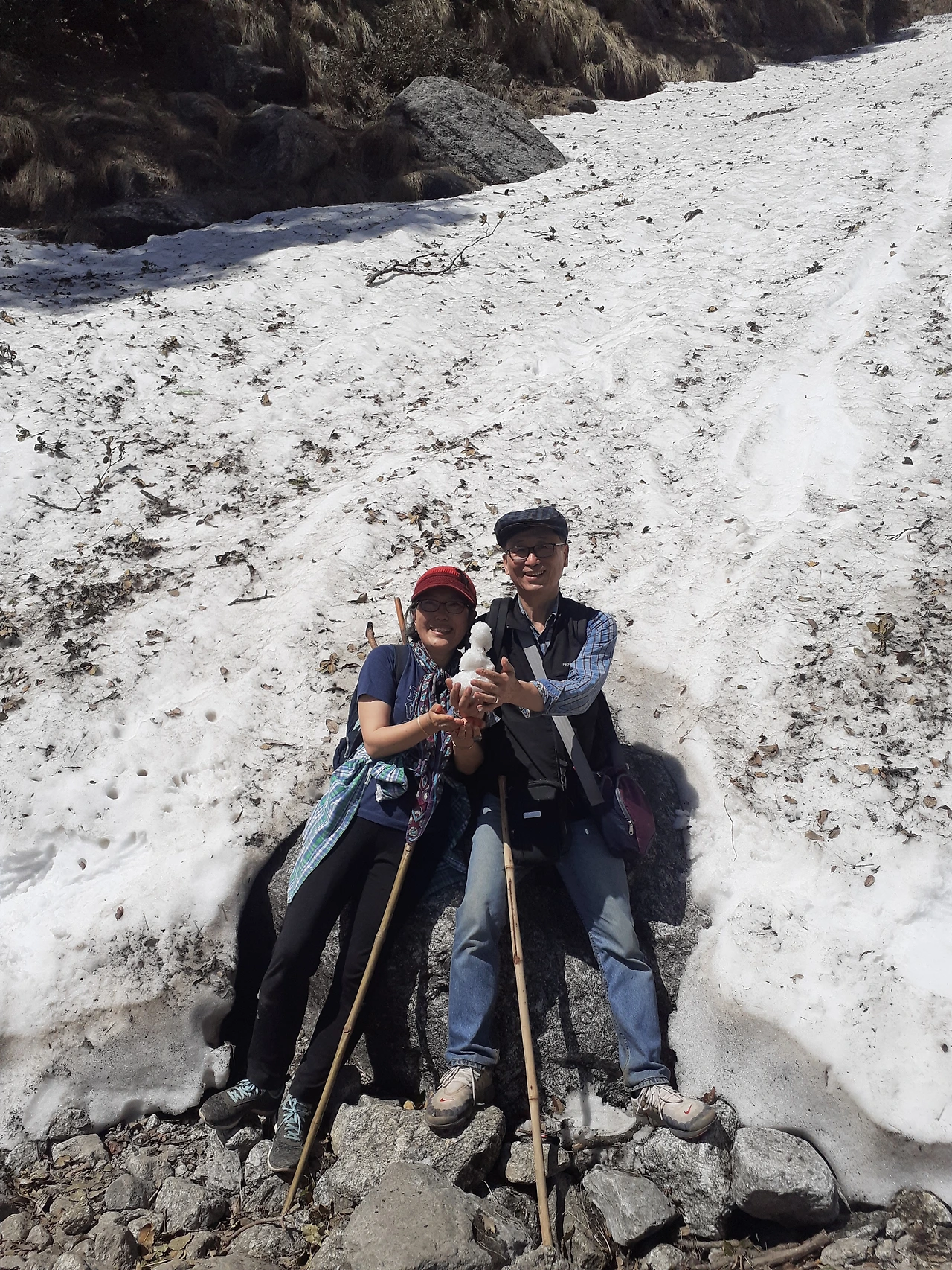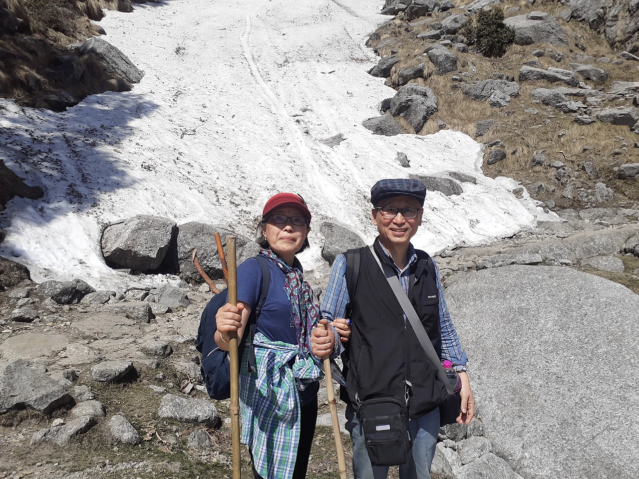 1시간 가량 설산을 보면서 감탄하고 사진도 찍고 쉬다가 야영하는 곳으로 이동했습니다. 눈이 쌓였던 곳이라 곳곳이 질척합니다. 소들과 말들이 방목되어 돋아난 풀들을 뜯어먹고 있습니다. 커다란 바위와 작은 바위들이 많이 있어서 걸을때 조심해서 내려왔습니다.