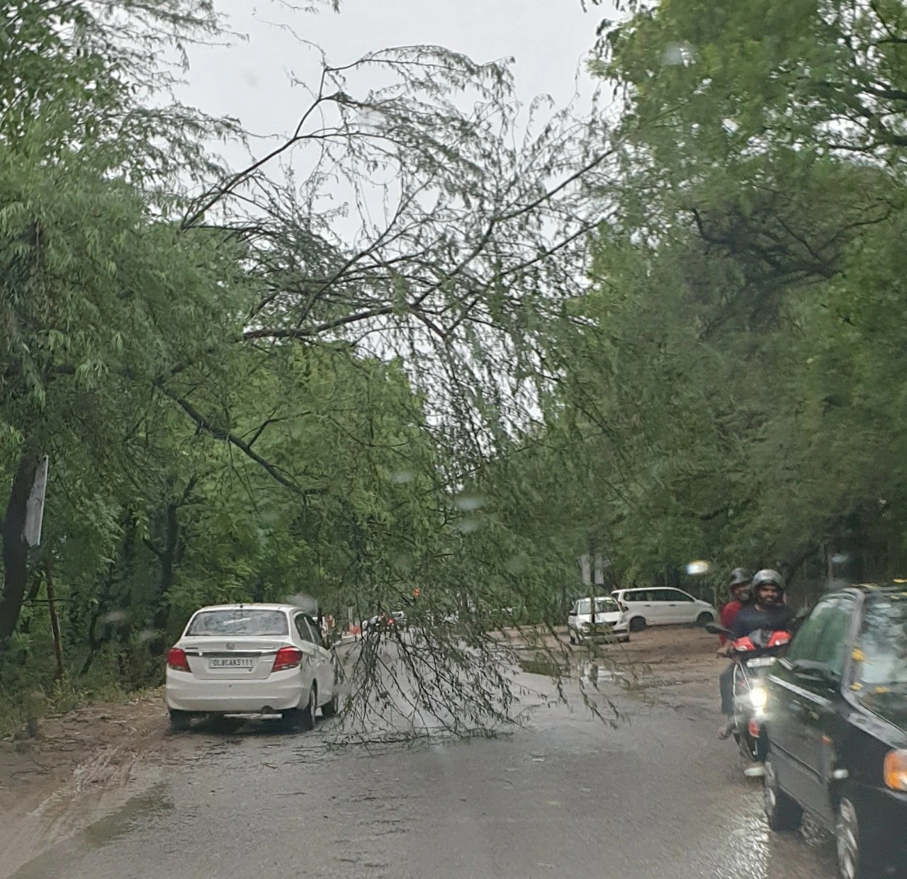 이쪽 아라밸리 길이 초행이라는 트럭기사 왈, 우리 일행을 태워주려고 평소엔 오지도 않았을 이 길을 온 것 같다고 말합니다. 같은 말이라도 어찌 이리 고맙게 말할지요? 쓰러져 있는 나무를 넘어서 앞으로 가다보니 중간 게이트 문이 잠겨 있습니다. 거기서 차를 주차해 둔 공원 입구까지는 멀지 않지만 억수로 내리는 비 맞으며 걷기엔 무리라 생각되어 반대방향으로 가다가 큰 길에 내려주면 우버나 릭샤를 타야겠다는 생각이 들었습니다. 크게 돌아가더라도 비를 피하는 게 낫거든요. 우리의 난생 처음 대장정의 길은 시작된 것입니다.