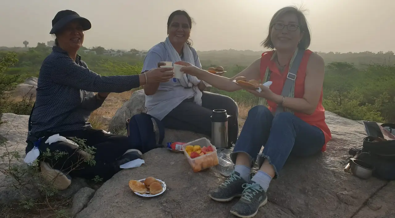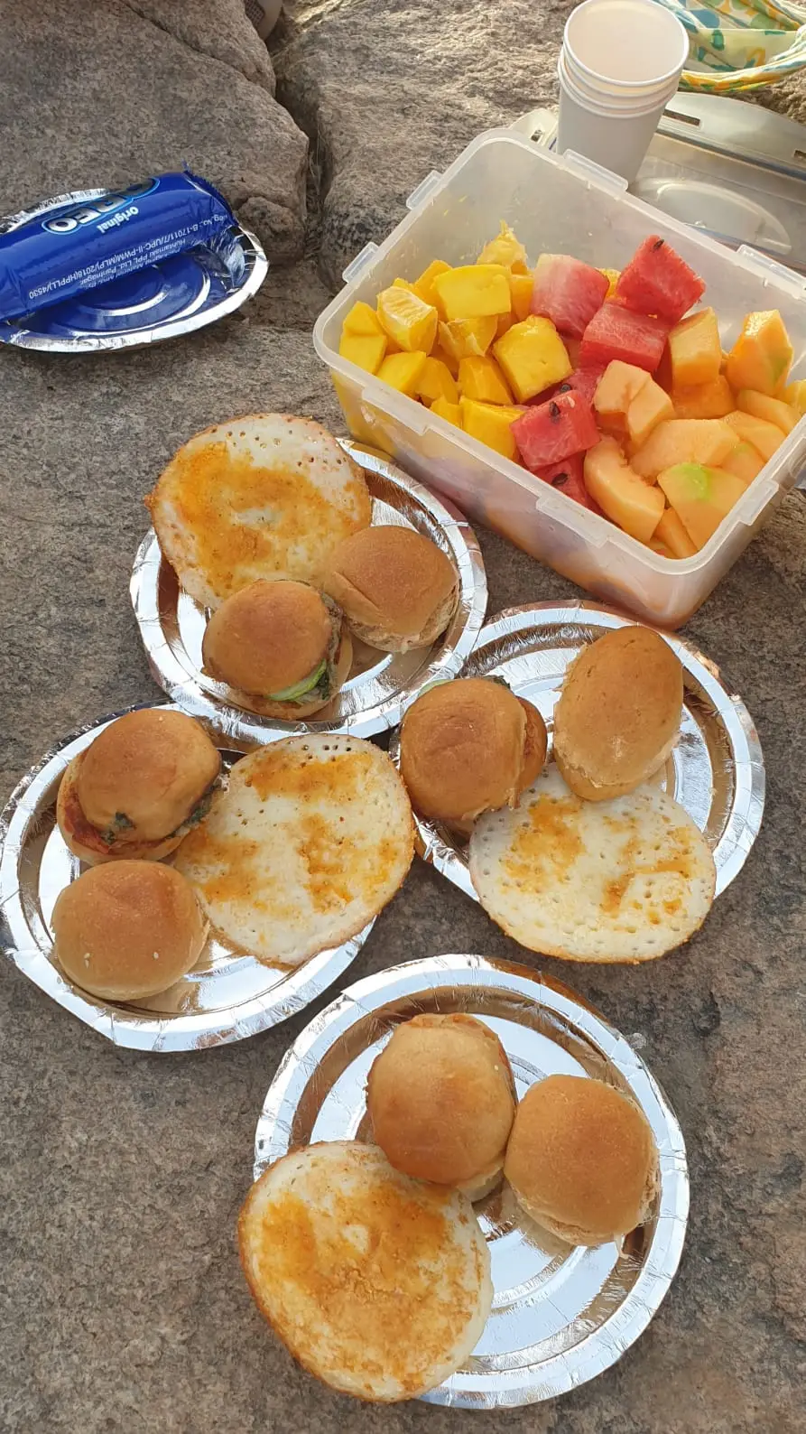 로미는 두가지 패티가 든 아따 버거를, 라다는 건파우더를 뿌린 이들리를, 나는 차이와 과일을 준비해 갔다ㅡ