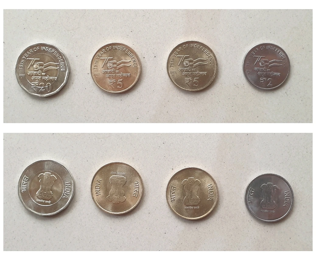 인도에서 새로이 주조된 20루피와 2루피 짜리 동전, 인도 독립 75주년 기념 주화이다.