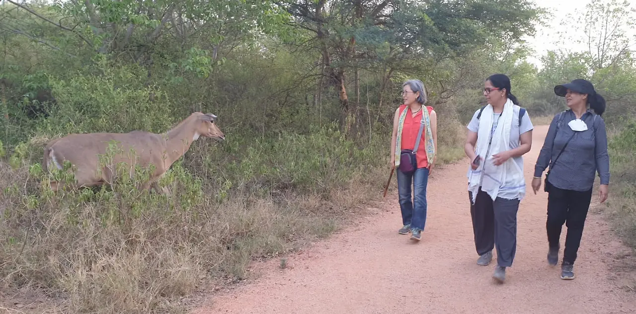 오늘은 운이 좋은 날입니다. 라다를 만나러 가는 길에 닐가이Nilgai를 만났습니다. 어미를 찾는 것 같이 겁에 질린 모습인데 사람을 무서워 하지 않습니다. 라다를 만나서 반기면서 걸어가는데 아까 그 닐가이가 숲길을 벗어나서 우리들의 산보하는 길로 나옵니다. 손을 뻗치면 쓰다듬을 수도 있는 지척인데요... 혹시 발길질 할까봐 물끄러미 바라보았습니다.