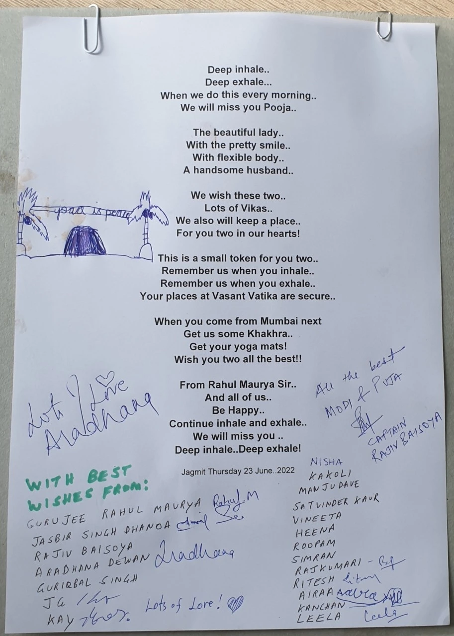 사려깊은 한 멤버가 이별을 아쉬워하면서 새로운 곳에서 건강하게 행복하라는 따뜻한 메시지를 담아왔습니다. 밤새 쓰고 출력해 온 정성이 남다르지요? 요가를 함께 한 모두의 이름을 새겼습니다