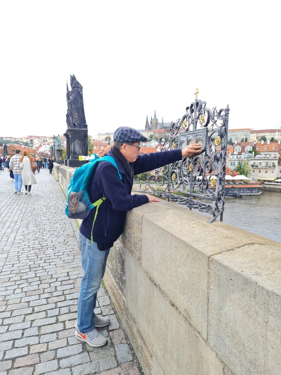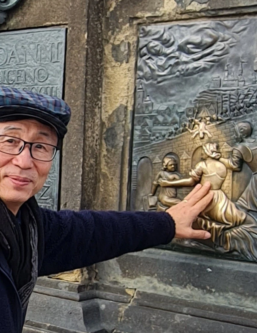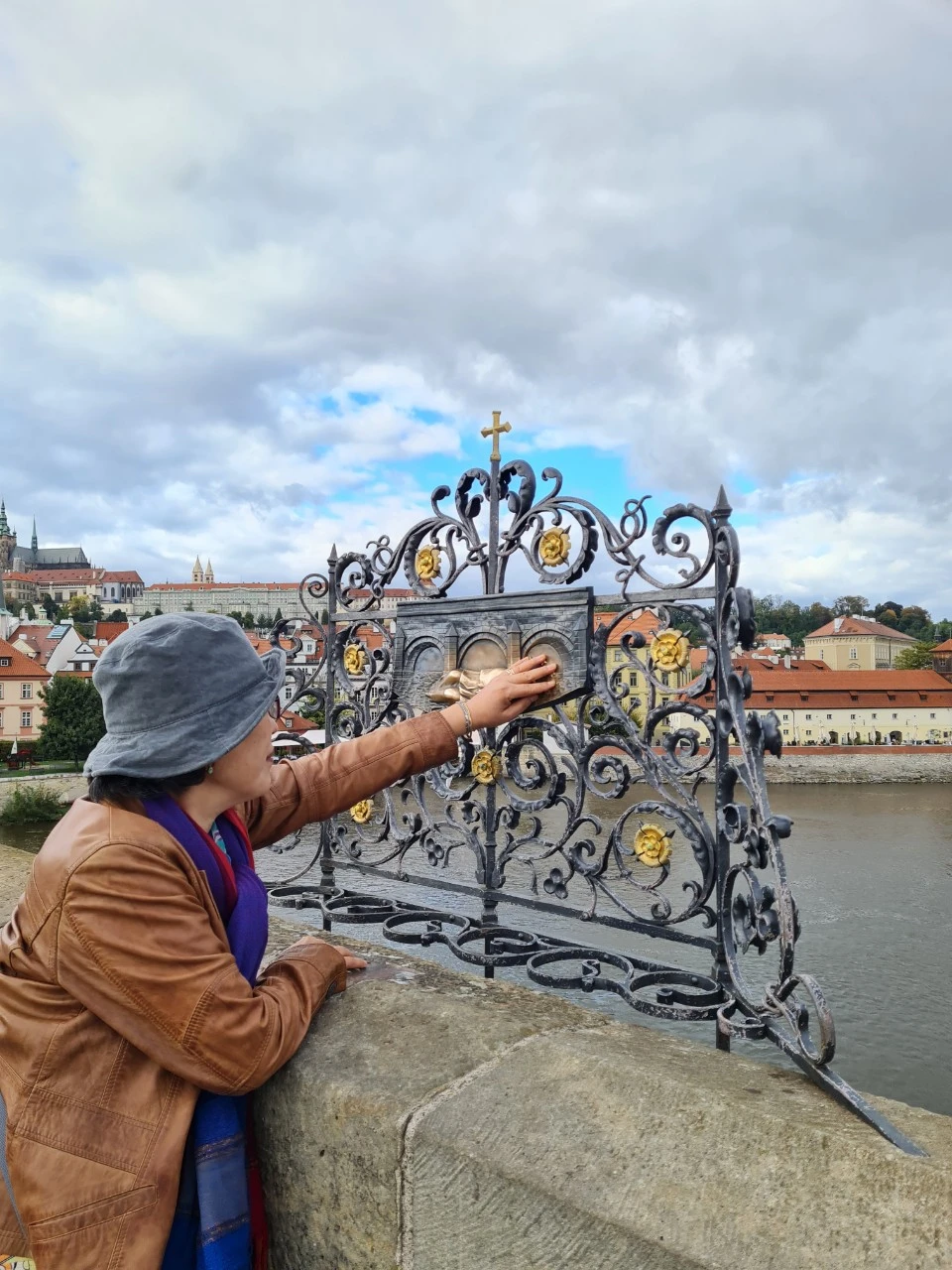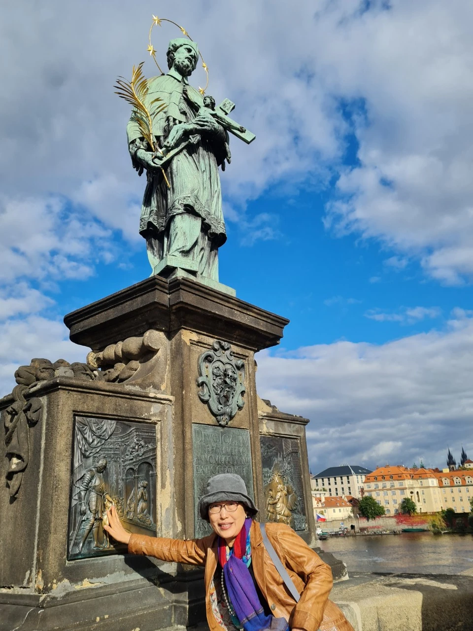 카를교를 지나면서 어느 주교님, 나중에 알고보니 네포무크 성인상의 개와 여인을 쓰다듬으면 사랑하는 사람과 다시 찾아온다고 하기에 열심히 쓰다듬었던 일, 작은 부조물의 별을, 오른손은 아래에 왼손은 위의 별을 모두 짚고 기도를 드리면 이루어 진다고 하기에 얼른 기도를 드렸다.