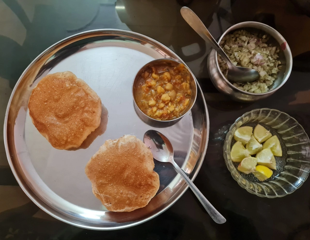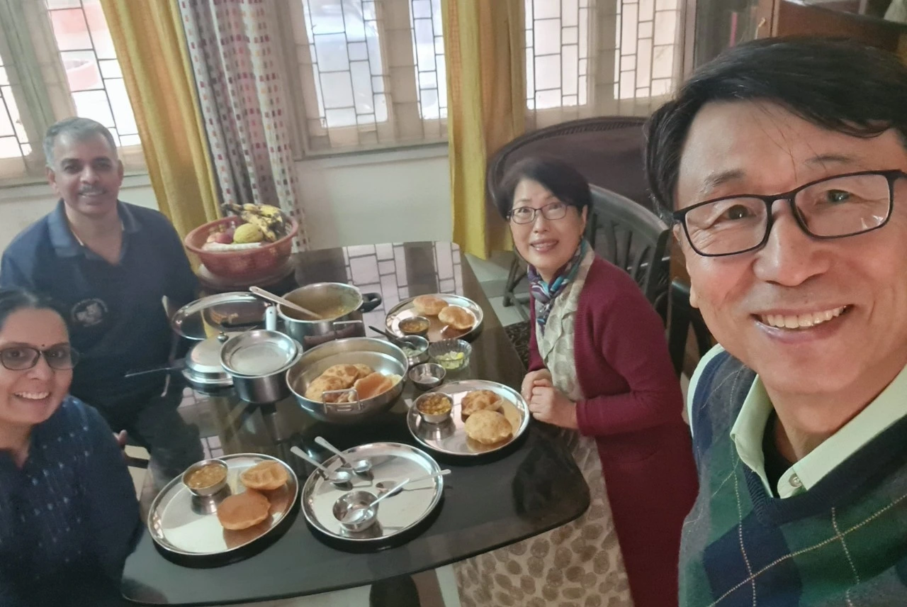 3. 인도 중상층 지인네의 소박한 늦은 아침 식단입니다. 격식없는 사이라 편안하게 자리를 같이 했는데요, 부풀어 오른 뿌리(Puri)빵을 5개 먹었고, 썹지는 무한 리필입니다.^^
