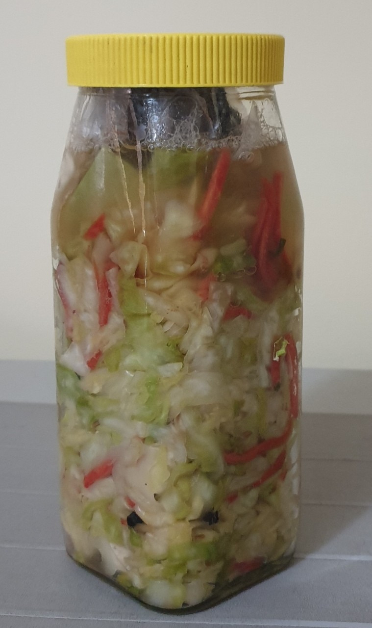 꿀병 1.3킬로짜리에다가 양배추 한통과 작은 홍당무 한개로 담근 자우어 크라우트입니다. 위에는 작은 돌을 비닐로 싸서눌러놓았습니다.