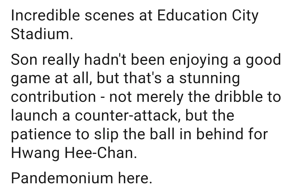 손흥민, 호쾌한 골은 선사하지 못했지만 손흥민이 아니었더라면 골로 연결할 수 없는 대단히 침착한 패스~~ 50여 미터 단독 질주 후 상대방의 다수 수비진에 막힌 상황에서 시간을 끌면서 인내하며 이들 수비들을 붙잡고 있다가, 대쉬하는 황희찬 선수에게 수비들 발 사이 빈 공간으로 툭치며 찔러준 패스는 아주 짧은 순간 동작이었다~~ 월드 클래스의 면모를 유감없이 보여줬습니다.