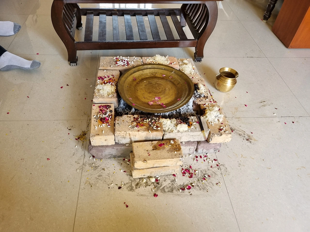 거실 한가운데 벽돌로 막고서는 불을 피웠습니다. 푸자.결혼식 등 제례식에서 불은 없어서는 안된다고 합니다.