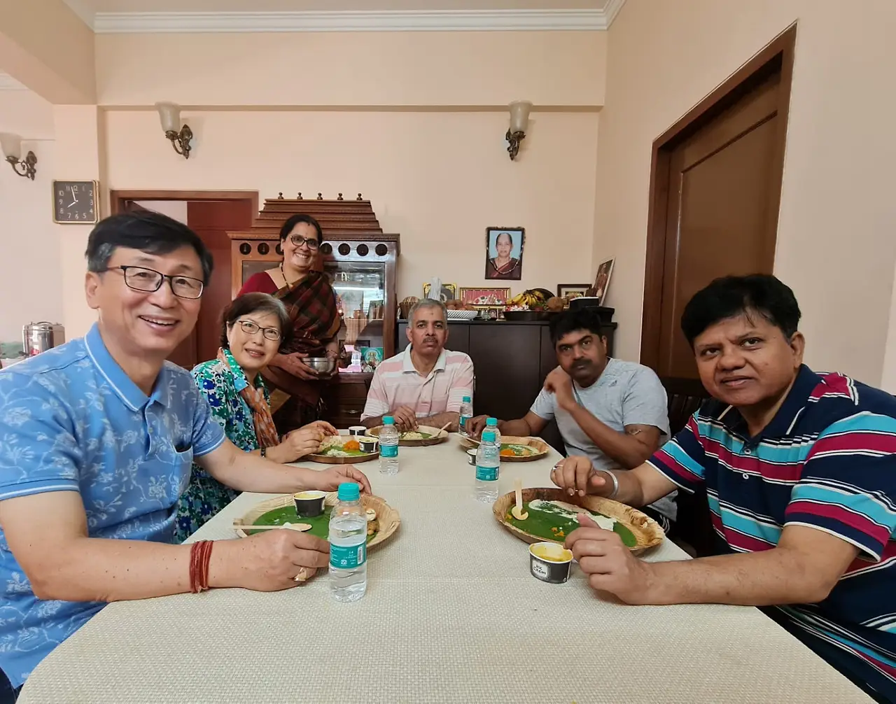 남인도 특유의 아침식사입니다. 바나나 잎사귀를 물로 닦아서 여러가지 메뉴를 서빙합니다. 라다 친구들과 큰 아들이 서빙담당입니다. 단촐한 메뉴처럼 보입니다만, 정성이 깃든 홈메이드 베지식단입니다. 삼바 스프와 스위트가 추가로 나왔습니다. 오고가면서 수시로 리필해 주기에 결국엔 포만감 느낄 때까지 먹게 됩니다.^^