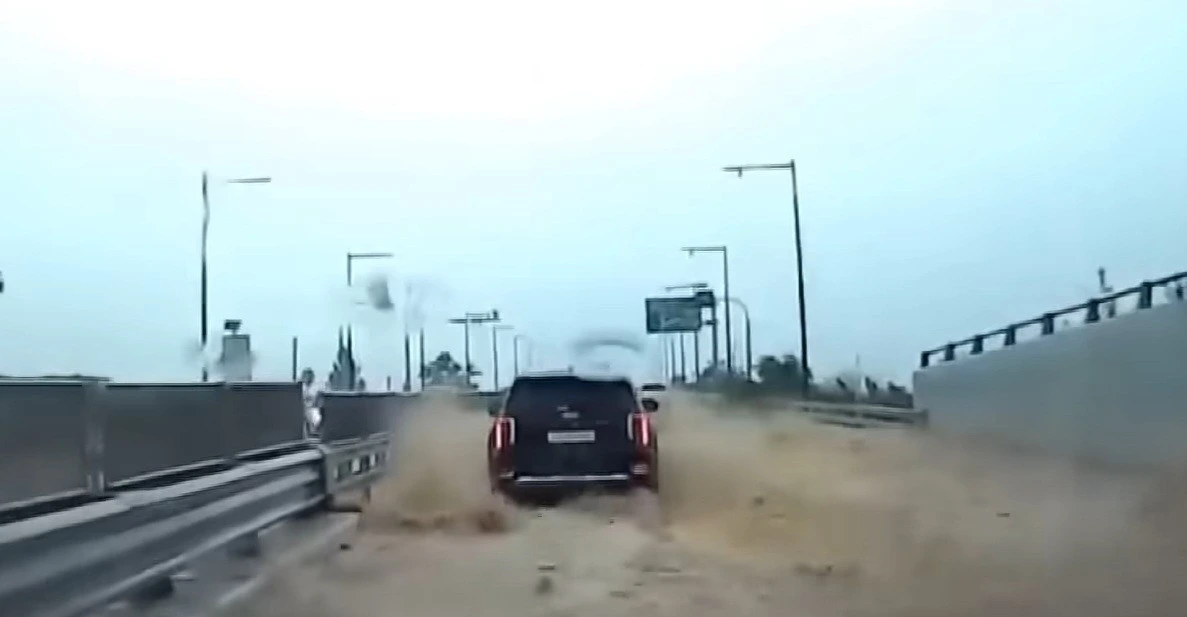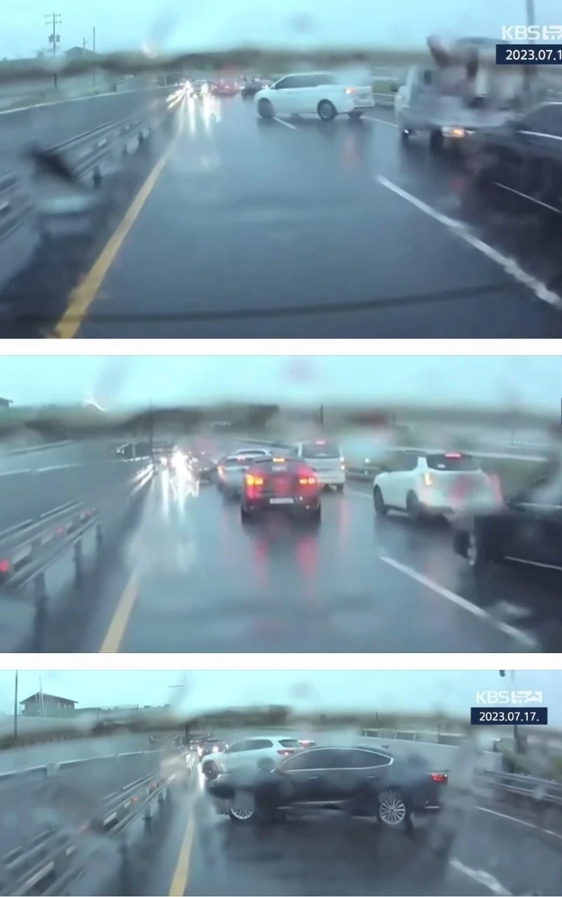 용케 출구로 빠져나왔는데... 옆 제방뚝이 무너지면서 순식간에 엄청난 물이 쏟아져 들어옵니다. 아직 괜찮아 보이는 옆차선에선 차량들이 들어오고 있습니다.