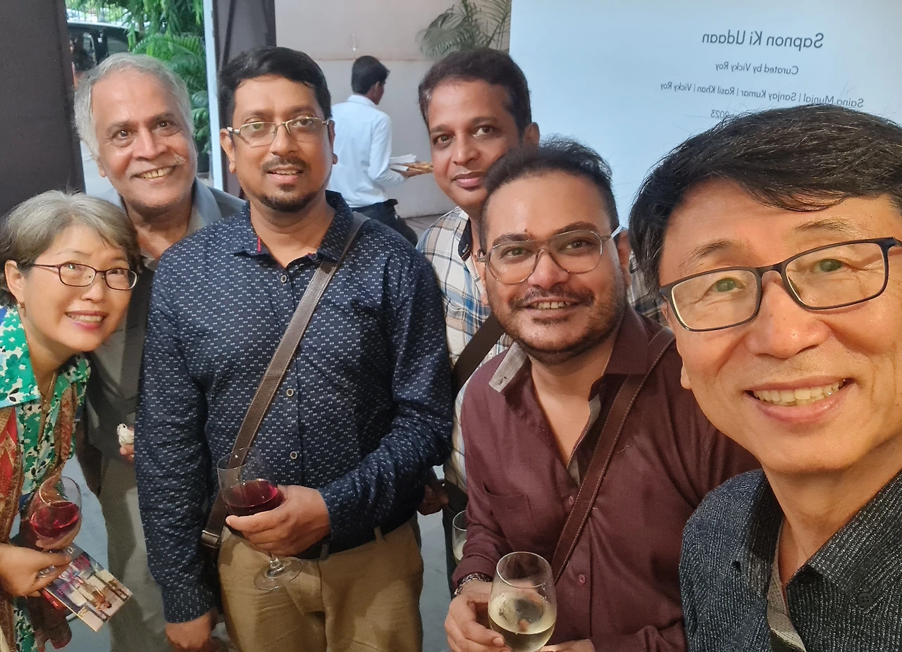 델리 동남부의 부촌인 Defence Colony에 위치한 갤러리는 진입로가 좁은데 많은 손님들의 차들로 북새통을 이룹니다. 간신히 주차하고 들어서니 참석한 손님들 옷차림이 예사롭지 않습니다. 고급 사교모임장에 왔나 싶었습니다. 와인과 핑거푸드들이 서빙되고 있었고... 입구에 남편의 지인이 있어 인사를 나눴더니만 EV(전기차) 포럼 대표로써 알고보니 그의 12학년 딸 작품 사진전이었습니다. 작가인 그의 딸과 가족들과 함께 사진을 찍었습니다. 알고보니 대입을 앞둔 딸과 친구들의 작품 데뷔전이더라고요.