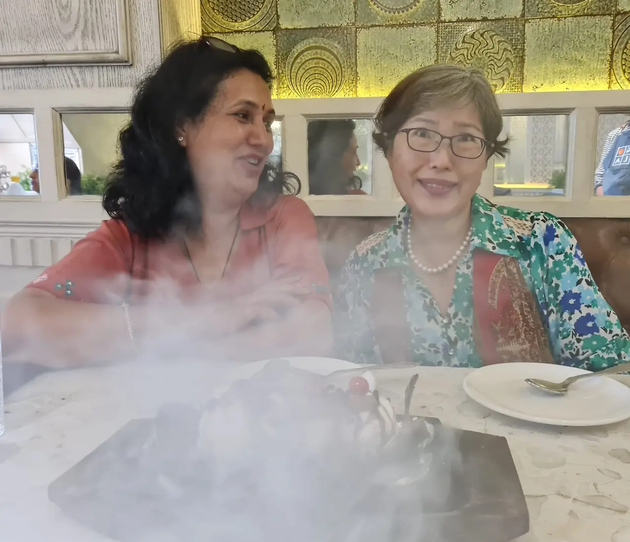 지글지글 거리는 무쇠판에 베지와 논베지음식이 등장합니다. 각각 밥과 국수를 시켰는데요... 간은 저희 부부가 워낙 싱겁게 먹으니 좀 짜다고 느낄 정도지만 보통 사람들에게는 간이 딱 맞는 정도로 눈과 귀가 호강했습니다. 비쥬얼이 굉장합니다. 여름이라 논베지는 닭요리를 시켰는데 여러 야채를 판에 골고루 담고 볶음 국수를 얹고 그위에 치킨까스를 잘라서 얹은 것입니다. 연기가 피어오르고 지글거리는 큰 판을 보자니 없던 식욕도 생길 판입니다. 지인의 베지요리도 맛있었는데 빠니르를 얹은 것이 인도식 중국철판요리네요. 가격은 좀 셉니다. 베지 900루피 논베지 1100-1500루피정도였던 것 같아요. 지인 말에 의하면 코로나 이후로 가격이 많이 오른듯 하답니다. 하기사 어딘들 인상 안된 것이 있을까요? 12시반에 저희가 1착으로 들어왔는데 30분정도가 지나니 열좌석 정도가 다 찼습니다. 2층도 있다니 맛집 맞습니다.