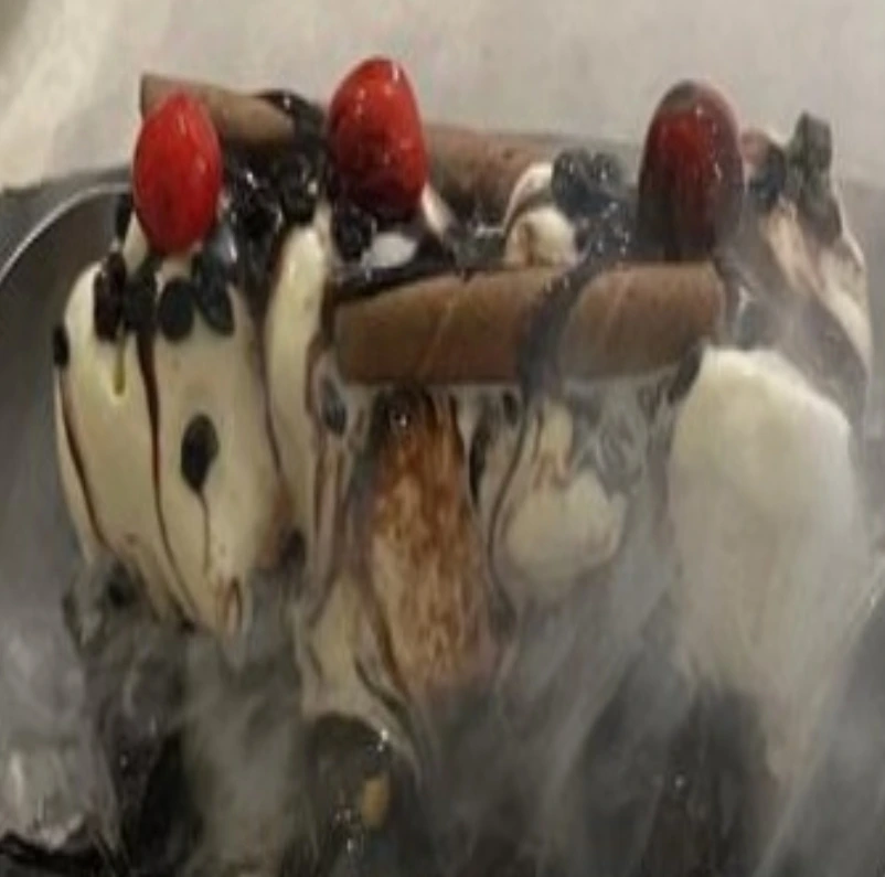 그랬더니 또 지글지글 보글보글하며 회색의 연기를 뿜어대며 나타난 엄청난 비쥬얼의 아이스크림, 밑에는 쵸코 케익이 깔려있고 아이스크림 세스쿱이 과자와 함께 놓여 있어요. 우리 셋이 충분히 먹을 정도여서 즐거운 경험 많이 했습니다.