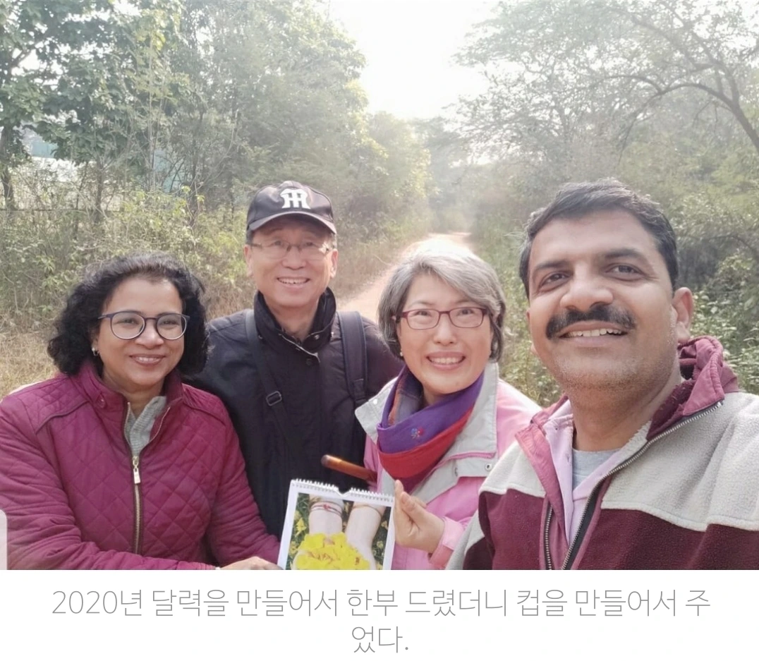 우리들은 아라밸리의 자연을 중점으로 매년 달력을 만들어 모닝워커들과 나누고 있다. 그런데 몇년전에 이 의사부부는 감사의 표시로 머그컵에 함께 찍은 사진을 코팅해서 우리에게 새해 선물로 주었다. 달력 만들기는 댓가를 바라고 한 일도 아니고 아라밸리라는 공통의 주제를 가지고 걷기 이웃들 백여명의 얼굴과 이름을 서로 알면 더 의미가 있으려니해서 시작한 일이다. 그렇지만 감사의 표시로 정성스런 선물을 답례로 주는 이들은 매우 드물다. 얼마나 감사한 일인지... 그 선물이 오래도록 기억나는 의사부부이다.
