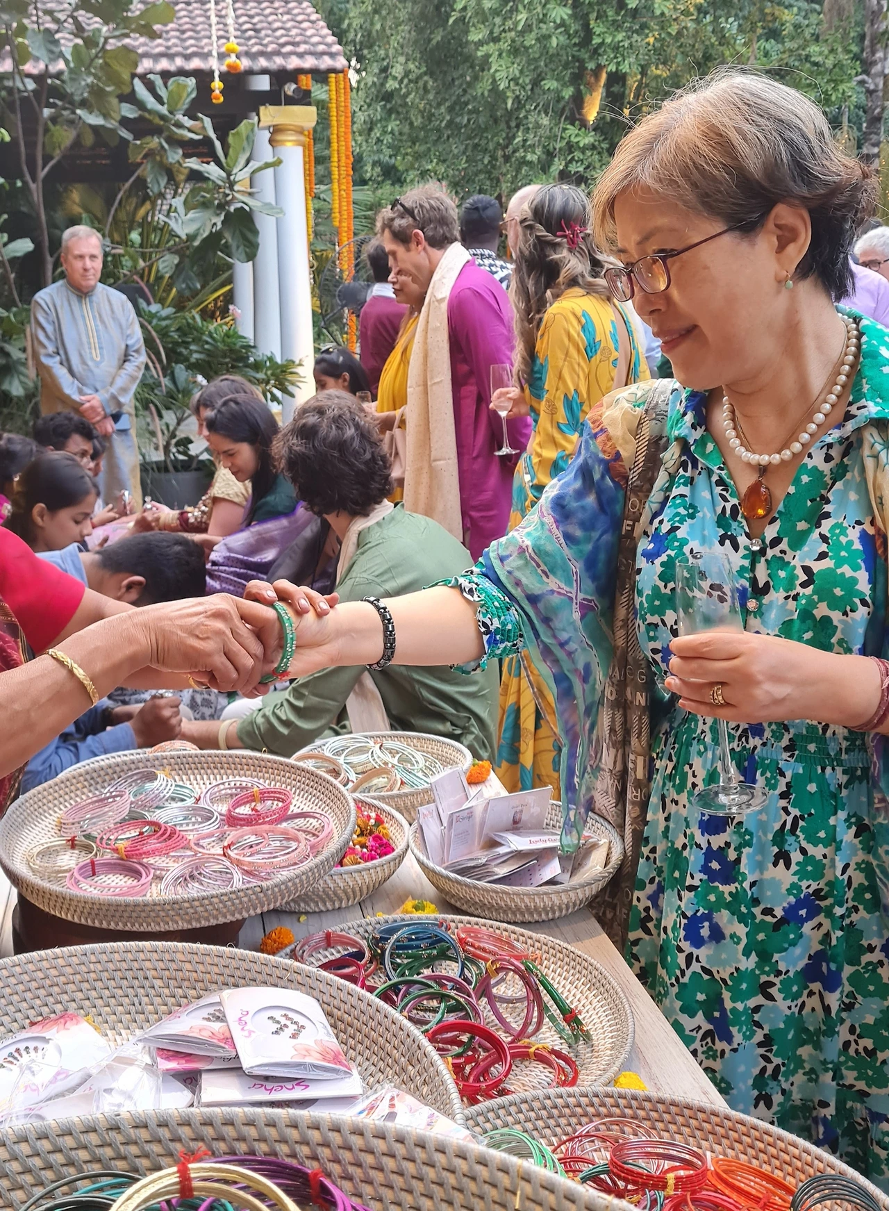 역시, 춤이 빠질 수 없습니다. 오늘은 펀잡 춤을 선택했습니다. 펀잡 춤꾼을 불러서 하객들과 함께 춥니다. 이날의 주제, 메헨디도 빼놓을 수 없습니다. 그리고 뱅글을 한개씩 선택하게 해서 저는 옷에 어울리는 초록색 뱅글을 골랐는데 찰랑거리는 소리가 상큼합니다.