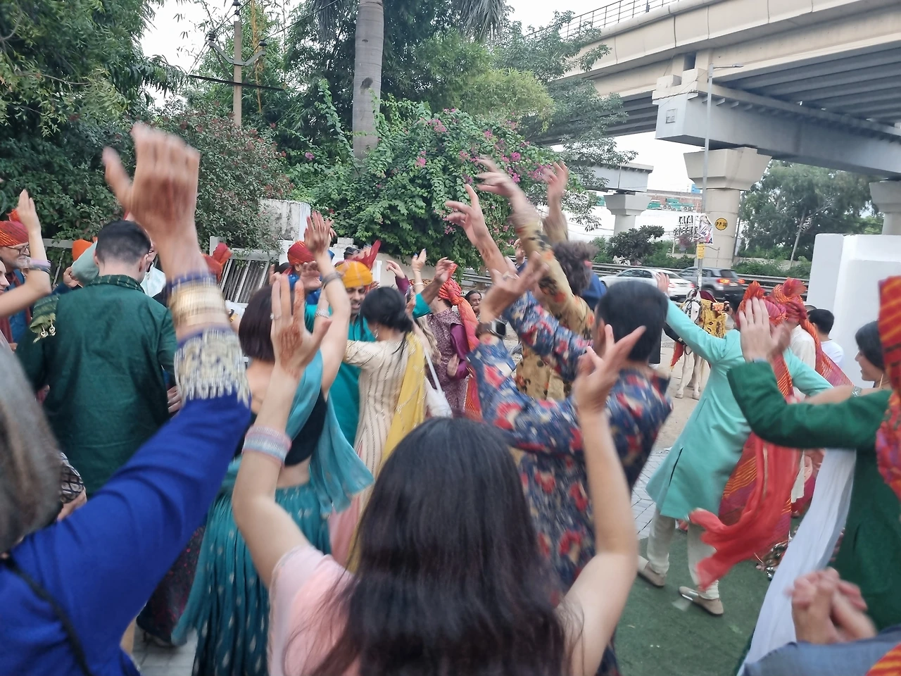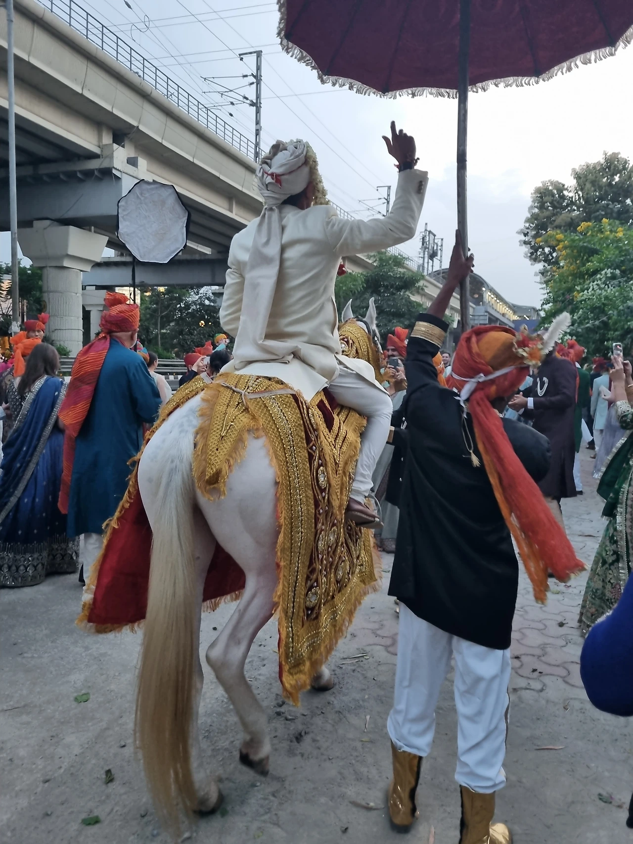 주차장 후문에서 친지,친구들과 춤추다가 대기해놓은 백마을 타고 정문으로 가는 행렬. 바로 앞에 지나가는 메트로의 승객들에게 볼거리 제공했다!