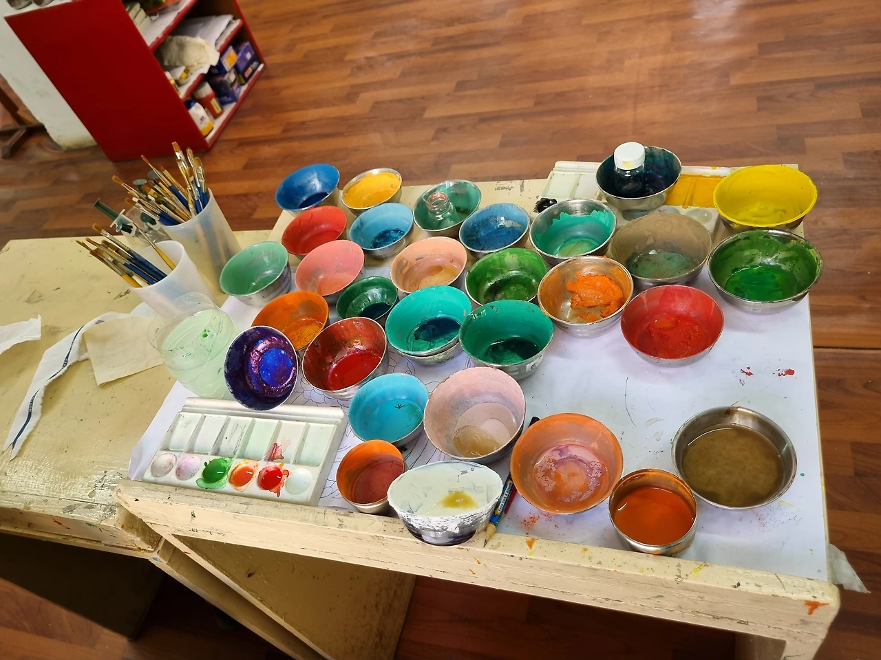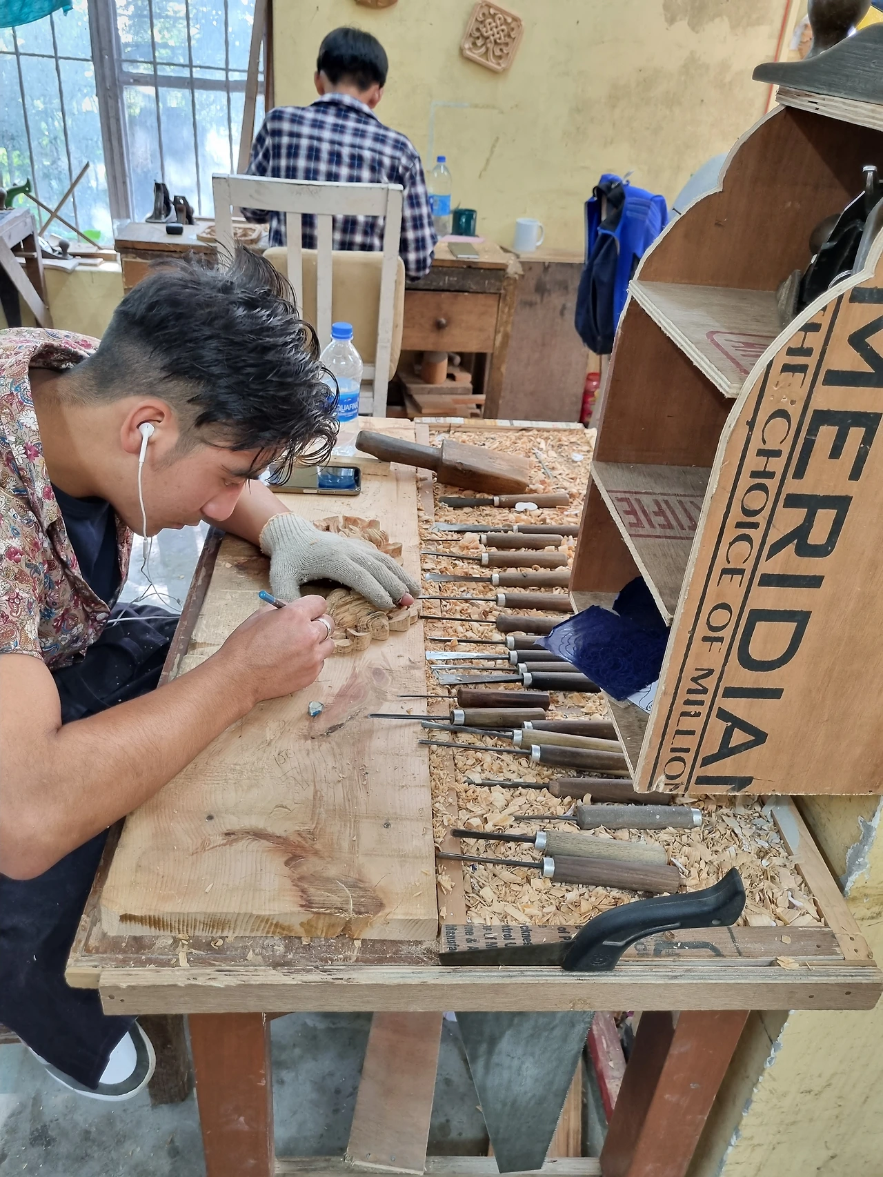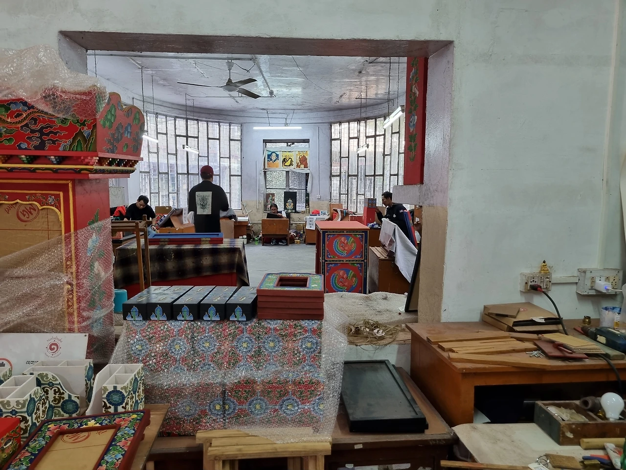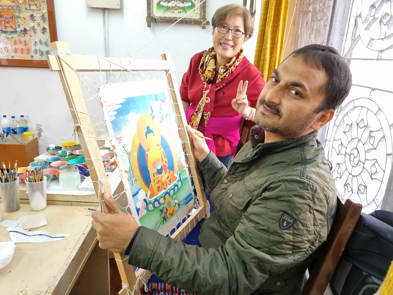목공예하는 사람, 디자인하는 사람, 옷이나 가방 만드는 사람, 색칠하는 사람, 탱화그리는 사람, 동을 두드려서 문양만드는 사람들이 각각의 방마다 자리하고 있었는데 평생을 공방에서 보낸다고 합니다. 뭄바이의 한 디자이너는 탱화를 배우러 와서 며칠동안 탱화를 그리고 있다고 하는데 사용하는 채색도구가 모두 자연에서 만든 것이라고 하네요... 누구나 교육비를 내고 와서 기초부터 배울수 있다고 합니다.